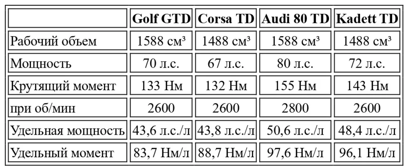 Напрашиваются два вывода. Во-первых, интеркулер, которым оснащены Kadett и Audi 80, творит чудеса, когда дело доходит до увеличения потенциала мотора (но не его КПД, как мы увидим позже). Если бы Golf мог рассчитывать на 80-сильный мотор от Audi 80 (и Passat), более мощный (но и очень «пустой» на низких и средних оборотах, ниже 3000 об/мин), у него были бы основания превзойти Kadett с его «маленьким» 1.5 Diesel Turbo Intercooler, по крайней мере, в чистой динамике. Но у VW наверняка есть другие идеи относительно будущего своего знаменитого GTD. Во-вторых, именно по показателю Нм/л двигатель Isuzu сильнее всего отличается от своего немецкого собрата, разумеется, без учета влияния интеркулера.