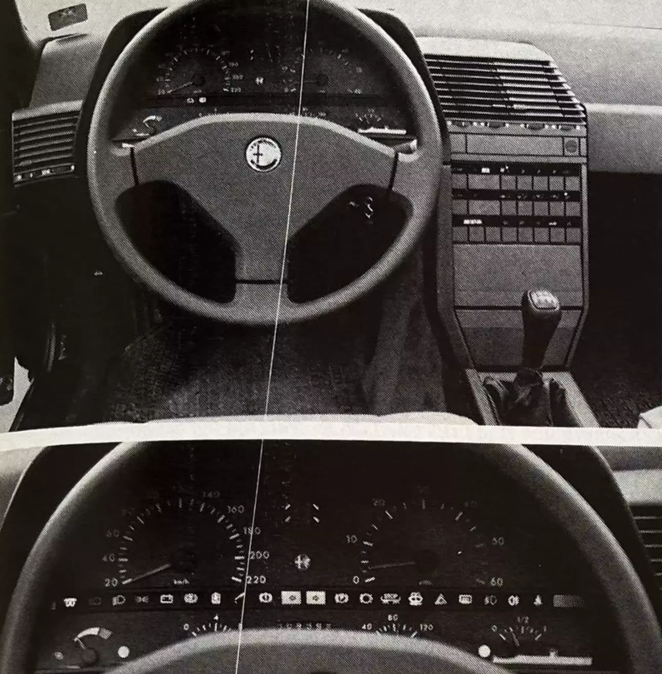 Для решения всех проблем с отоплением в 164 есть один выход: автоматический климат-контроль. Настроенный на 20°, он сам обо всем позаботится. Это едва ли не единственная опция, которую можно горячо рекомендовать, и, наряду с ABS, это, к сожалению, именно то, что больше всего задирает цену. В остальном же серийное оснащение изначально очень полное: загляните в список оборудования, чтобы в этом убедиться. Что, увы, нельзя исправить, так это оформление приборной панели, усеянной множеством крупных кнопок. Как можно быть одновременно столь элегантным снаружи и столь вызывающе безвкусным внутри? Щиток приборов, впрочем, очень четкий благодаря двум большим шкалам тахометра и спидометра, выполнен в духе «рождественской елки» — до такой степени, что теряешься перед бесчисленными индикаторами, загорающимися разом. Легкая нотка ностальгии: куда делись классические круглые приборы Alfa Romeo, которые мы так любили, где благородное дерево гармонировало со спортивной атмосферой?