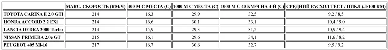Унаследовав самый мощный двигатель в своей истории, Toyota Carina E воспользовалась случаем, чтобы примерить имя, которое еще несколько лет назад было синонимом драйва. Однако в те времена — да и сегодня — почти мифическая аббревиатура GTI была прерогативой компактных хэтчбеков длиной около 4 метров. Toyota Carina E при длине 4,53 м и, главное, массе 1220 кг, без колебаний присвоила себе этот ныне девальвированный индекс. Раньше входной билет в закрытый клуб GTI был прост: нужно было выйти из 30 секунд на километре с места. Японский производитель номер один заявляет для своего спортивного седана: 215 км/ч «максималки» и 8,4 сек. до 100 км/ч. Пари почти выиграно: мы получили 214 км/ч и 8,7 сек. соответственно. На километре с места Toyota Carina E GTI не хватило всего одной десятой секунды, чтобы провалить «экзамен». Неплохо, скажут некоторые. Но они наверняка не видели цифр, показанных 133-сильной версией GLi. Последняя — протестированная нами ранее — была не сильно медленнее: 9,3 сек. до сотни и 30,6 сек. на километре. Разница не столь велика, как того требовал разрыв в 25 л.с. В эластичности GTI также не удается совершить прорыв. Тем не менее, GTI демонстрирует более чем достойные секунды, позволяющие ей получить небольшое преимущество над почти всеми звездами категории: новым Peugeot 405 Mi-16 с его 152-сильным мотором, Opel Vectra 2000 16V или Nissan Primera GTe. Впечатляет!