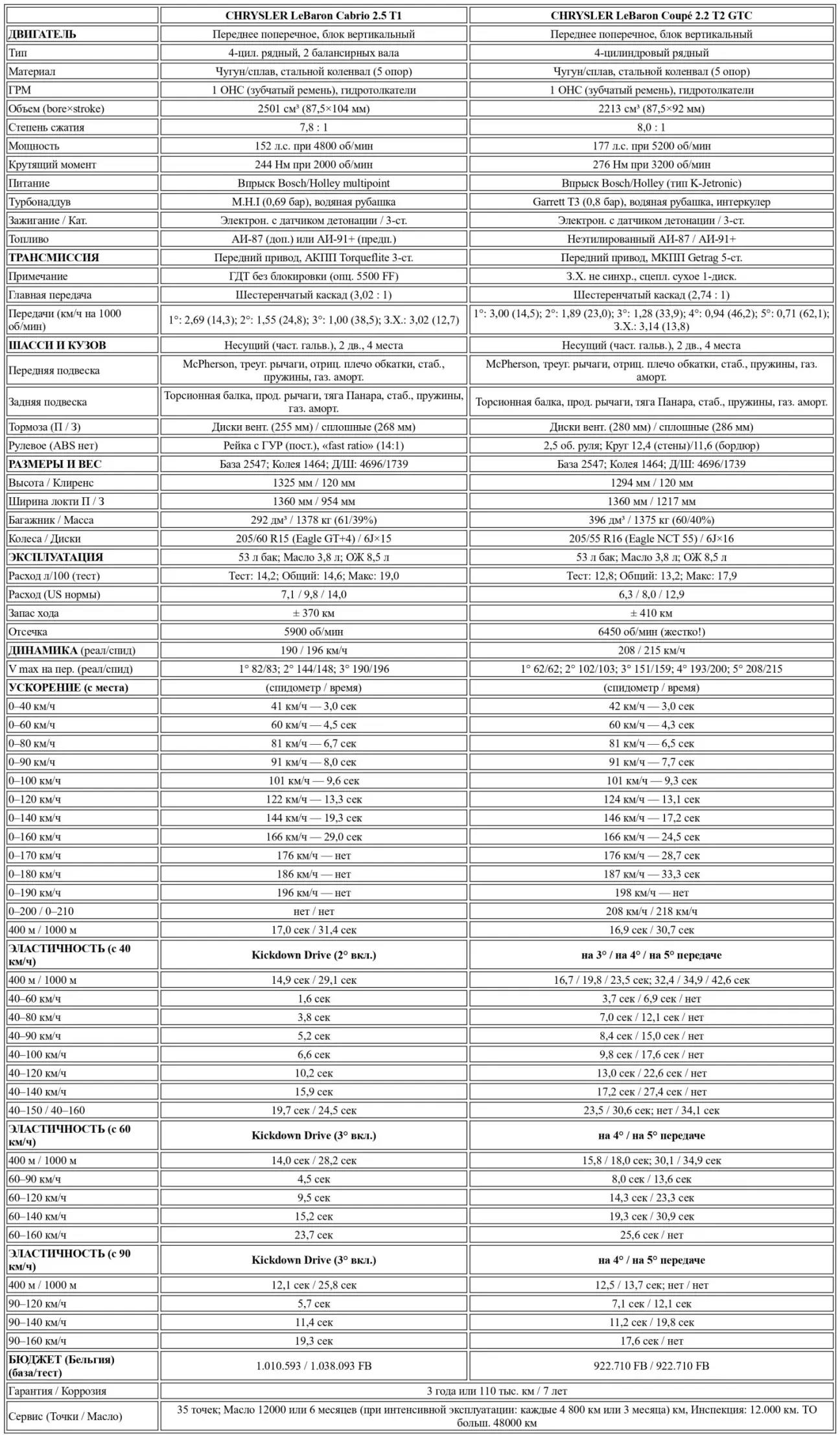 2) Купе GTC 2.2 Turbo 2 мощностью 177 л.с. выглядит более воинственно в своем ярко-красном наряде. Он лишился хрома, но кажется еще более кричащим. И едва ли более быстрым, хотя полон апломба и весь «в шинах» на ужесточенных подвесках. При этом потребляет меньше — спасибо интеркулеру. Весь потенциал, который привносит витаминная доработка «дядюшки Шелби» — мотор более мощный, но еще более неровный и грубый, 5-ступенчатая «механика» с длинными передачами и отталкивающим приводом, инертный до определенного порога наддув — на уже тяжелом кузове и с немного «пустой» рейкой превращается в мощную мускулатуру «бигфута», совершенно не пригодную для реализации. Разве что на прямиках пустыни Мохаве. В Европе он никого не запугает и не найдет много возможностей ни для разогрева, ни для самовыражения. В конечном счете — не забывая о щедрости и обещаниях японок в этом сегменте, который они реанимировали, — наши LeBaron не смогут потягаться с BMW и прочими латинскими купе/кабриолетами или британскими реликвиями в плане «водительского чутья» (driving flair). Хотя комбинация купе или кабриолета Saab 900 Turbo 16 не уходит в этой главе намного дальше (инерция турбины, слегка пасующий передний мост…); пусть он и везет бодрее, но стоит намного дороже.