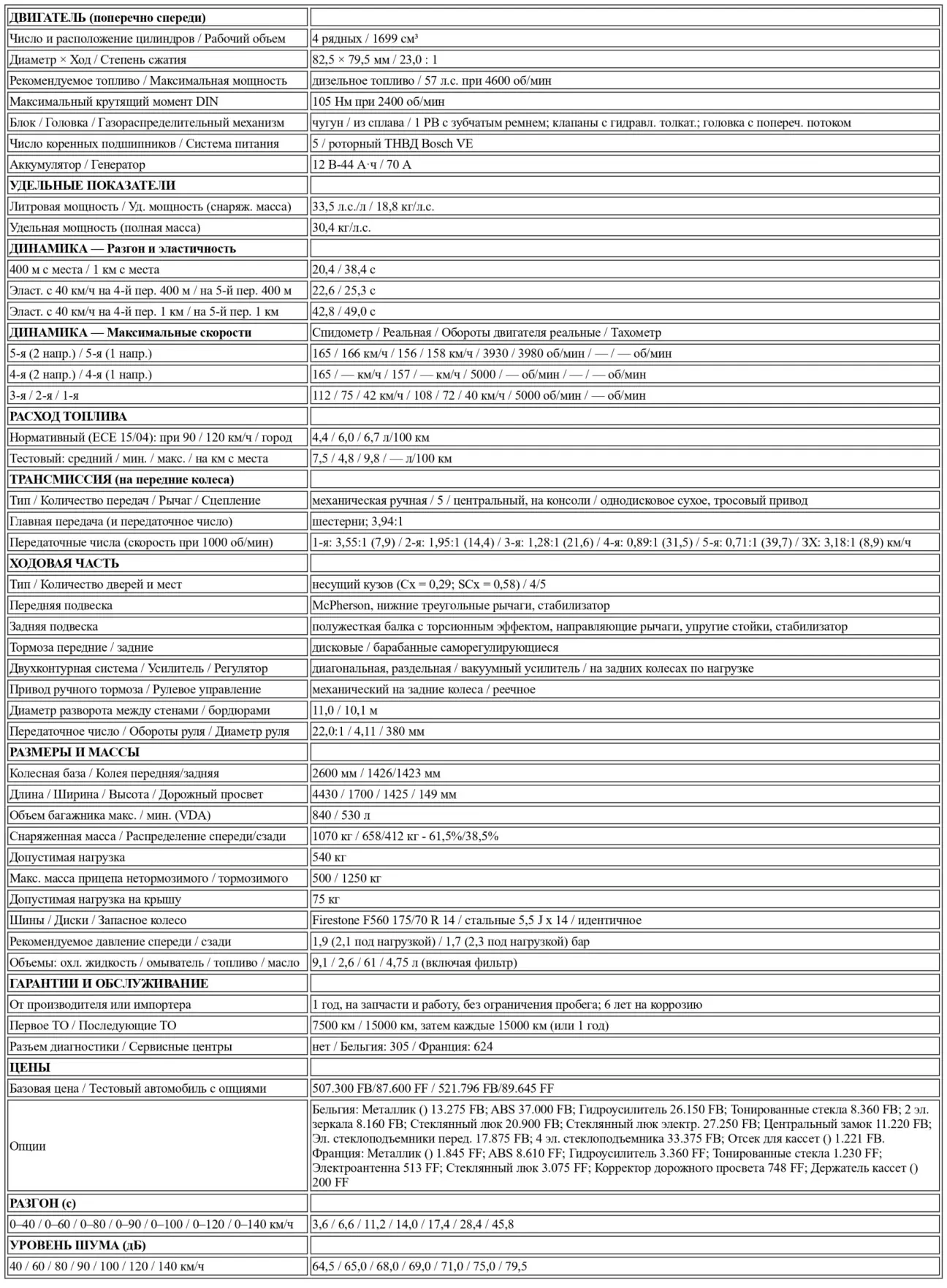 Правда в том, что нужно уметь расставлять приоритеты и не судить предвзято, в абсолютных величинах, дизельную Vectra со скромной моторизацией и, к тому же, очень просто одетую в версии GL — именно в таком виде она, скорее всего, будет использоваться чаще всего. Правда, перспектива полноценного сеанса за рулем «57-сильной» Vectra априори не кажется заманчивой, а первое впечатление при нажатии акселератора «в пол» — чисто из любопытства — нельзя назвать вдохновляющим. Но правда и в том, что большинство ее конкурентов находятся в схожем положении, и сравнивать нужно сравнимое. Два девиза, которых стоит придерживаться перед продолжением: «снисходительность» и «терпение»... в определенных пределах, разумеется. Что также следует учитывать, так это доплату по сравнению с бензиновой 1400 (75 л.с., то есть почти на двадцать больше), которая составляет около 60 000 бельгийских франков — сумму, которую придется «заморозить» минимум на 4–5 лет. Что касается соперников, то 4-дверная 1.7D при цене в районе 520 000 франков позиционируется скорее в верхней части рейтинга с учетом уровня оснащения GL: R21, BX, Sierra и (в Бельгии) японские представители (Nissan Bluebird, Mazda 626 и особенно Toyota Carina) в этом смысле выглядят более выгодными предложениями.