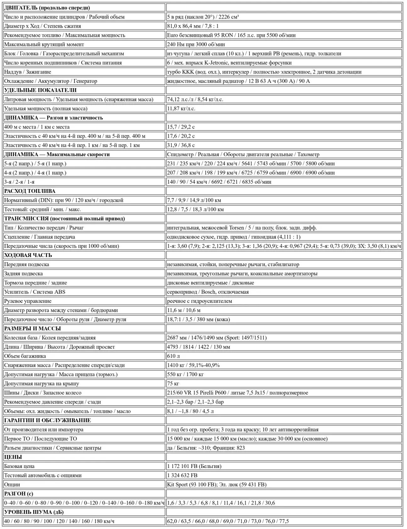 Если говорить точнее, это означает, что данный 2,2-литровый агрегат теперь работает со степенью сжатия, сниженной до 7,8 (против 8,6 у старой Audi 200), чтобы мириться с углом опережения зажигания, настроенным на посредственное до недавнего времени октановое число неэтилированного бензина, и не мешать работе кислородного датчика, поддерживающего стабильный состав смеси независимо от нагрузки (стехиометрическое соотношение 14,7 к 1). Судя по всему, эта диетическая резолюция вынудила его оставить 35 л.с. и 30 Нм под «утюгом» экологии. Он выдает свои 165 л.с. мощности на чуть более спокойном рабочем плато (на 300 об/мин ниже), чем его «сиамский близнец» без катализатора, но развивает свои 240 Нм крутящего момента при тех же 3000 об/мин. Демонстрируя при этом довольно плоскую кривую. Впрочем, это далеко до графика новой 20-клапанной Turbo (309 Нм уже с 1950 об/мин), которая по прямолинейности спорит с бильярдным кием. Короче говоря, если не считать комплексного электронного управления Bosch Motronic (совмещенные секвентальный впрыск и картографическое зажигание), облегченного маховика, кованых поршней, сдвоенных катализаторов (снижающих противодавление) и, конечно же, алюминиевой головки блока DOHC с 20 патрубками, позаимствованной у Quattro Sport группы B, — внутренности Audi 100 Turbo скрывают в себе исходный скарб великолепной Audi 200 20V. Потенциал налицо, включая интеркулер и турбину KKK. Без желания ошеломить любой ценой.