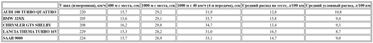 Наконец, по сравнению с уходящей 200-сильной Audi 200, из-за катализатора она потеряла одну и одну десятую секунды на километре с места (29,2 вместо 28,1 с), шесть десятых на 400 м (15,7 вместо 15,1 с) и около 12 км/ч максимальной скорости (220 км/ч при хорошей погоде — Ингольштадт заявляет лишь 216 км/ч для Audi 100 Turbo — против 232 км/ч у «грязной» Audi 200), но это не ухудшило показатели эластичности (по нашим замерам, она оказалась даже лучше прошлогодней 200-сильной машины). Одним словом, она раскрывается там, где, в конечном счете, берет начало удовольствие от вождения. Стоит ли добавлять что-то еще? По-прежнему благотворный, умеренный подхват турбины позволил сохранить отличные способности к ускорению на передачах, а возможно — и улучшить их. А время отклика маленькой турбины стало еще менее заметным, чем прежде, вплоть до того, что оно растворяется, сливаясь с моментом, выдаваемым мотором большего литража. И всё это с примерной учтивостью.