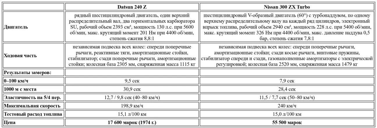 Когда в 1969 году концерн Nissan представил в Японии Datsun 240 Z, даже самые неисправимые оптимисты в руководстве компании не смели надеяться, что этот двухместный спорткар когда-нибудь побьет мировой рекорд. Линейка Z, открытая моделью 240 в 1969-м, два года назад — в сентябре 1983-го — отпраздновала производственный триумф: с конвейера сошел миллионный экземпляр. Никогда прежде спортивные автомобили одной серии не выпускались столь огромным тиражом. С годами 240 Z превратился в 280 ZX, но сегодня и он отправлен в тираж — актуальным вкладом Nissan в рынок спорткаров теперь зовется 300 ZX Turbo. Обладая мощностью 228 л.с. и максимальной скоростью 240 км/ч, ZX Turbo является самым быстрым японским автомобилем из тех, что официально продаются в Германии. У старого и нового Nissan осталось не так много общего, в чем редакция sport auto убедилась на очной ставке «отца» и «сына».