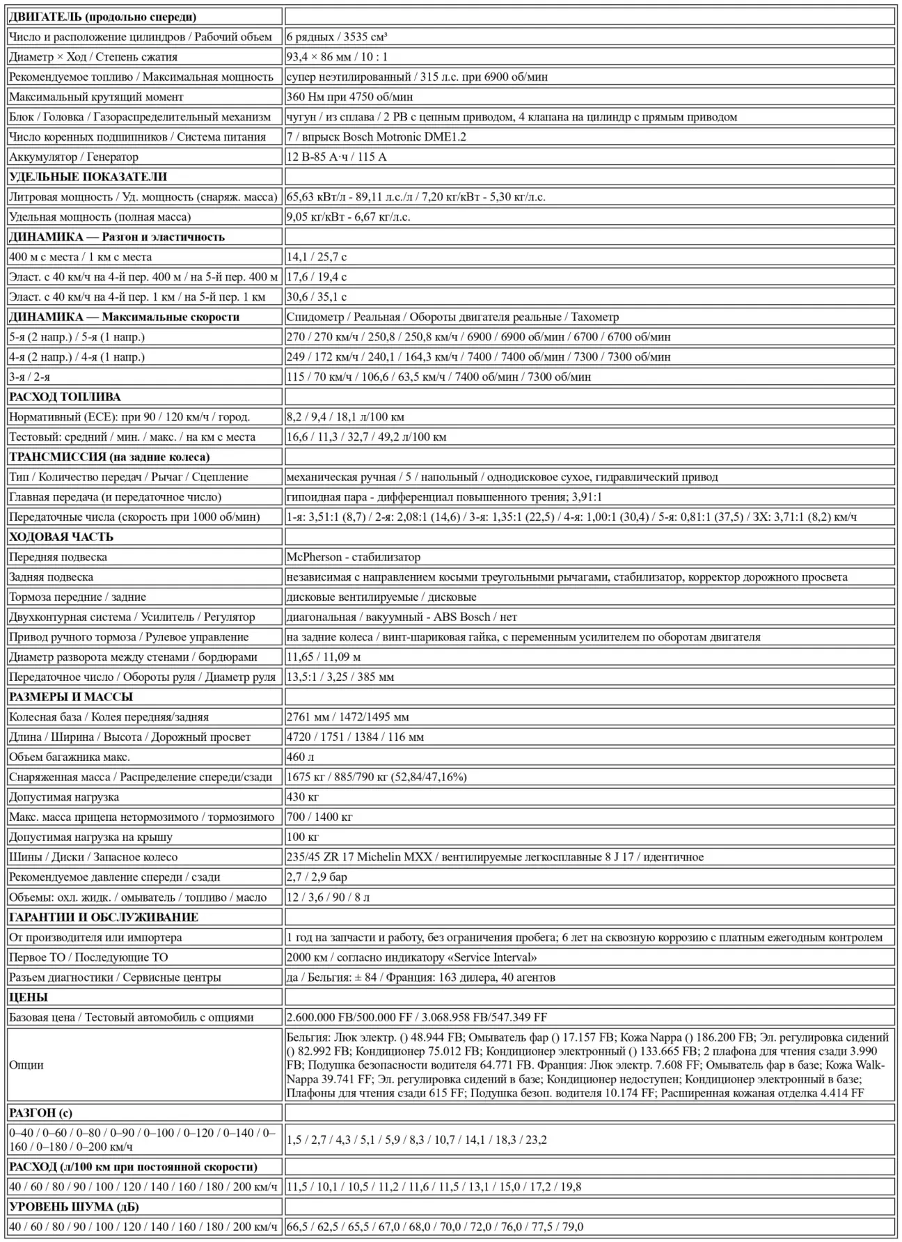 Мне утверждали, что ее максимальная скорость принудительно ограничена электроникой задолго до того, как будут исчерпаны реальные возможности мотора. Баварские инженеры не лукавили! Новая M5 способна на большее, чем те 250 км/ч, что зафиксировал хронометр в моих руках за рулем предоставленного автомобиля — темпа, на котором она осаживается с неожиданной резкостью и грубостью. Новый 3,5-литровый двигатель развивает 315 л.с. и великолепный крутящий момент в 360 Нм; он дарит крылья этому крупному седану, катапультируя его до 100 км/ч всего за 5,9 секунды (на 4 десятых быстрее паспортных данных производителя). Расход топлива? О нем не стоит и говорить. Имеет ли это большое значение для подобного автомобиля? Что ж, скажем так: он приближается к 17 л/100 км, становясь заметно скромнее на автомагистралях при равномерном движении. Но самое поразительное — это то, что новая M5 остается комфортабельным седаном. Обладая завидной шумоизоляцией и отделкой на уровне церемониального лимузина, она ограничивает число седоков тремя пассажирами помимо водителя, балуя их четырьмя глубокими креслами. Внешне в M5 есть некое неуловимое очарование, которое трудно распознать с ходу. Даже сверхширокие колеса идеально замаскированы в арках! Великолепная машина... Но доступная далеко не каждому кошельку. BMW остается верна своей политике отсутствия компромиссов и жертв; баварцы знают рецепт того, как нажить состояние и... компенсировать неудачи, зафиксированные на некоторых далеких и теряющих обороты рынках. Вероятно, BMW права, ведь, как и в случае с не менее удачной Z1, M5 не ведает недостатка в клиентах!