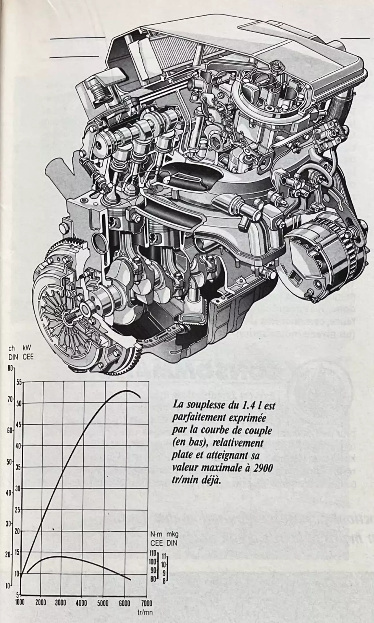 В сравнении с 1600-кубовым собратом диаметр цилиндра уменьшился с 86,5 до 80,5 мм при неизменном ходе поршня в 67,4 мм. Если более крупный двигатель располагает зажиганием Marelli Digiplex, то 1.4 довольствуется бесконтактным узлом. Двухкамерный карбюратор Weber (32/34 TLDE 4/150), тем не менее, снабжен системой принудительного холостого хода (экономайзером), отсекающей подачу топлива при сбросе газа. Версия 1400, как и все бензиновые модели Tipo, рассчитана на работу на неэтилированном бензине Eurosuper с октановым числом 95 RON. Несмотря на все эти технические усовершенствования, при холодном пуске все же приходится манипулировать «подсосом». Движение получается неуверенным до тех пор, пока мотор не достигнет рабочей температуры. В силу возраста этот двигатель не имеет ни гидрокомпенсаторов, ни даже системы автоматической регулировки. С цокотом клапанов борются с помощью регулировочных шайб и массивного охватывающего воздушного фильтра.