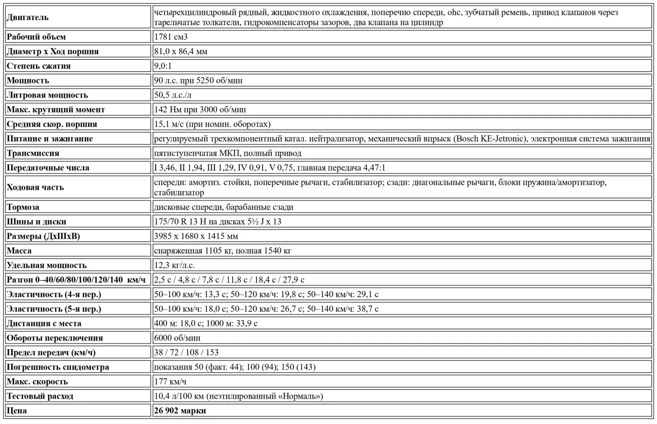 В итоге это означает, что тормоза сгорают в ускоренном темпе, потому что машину гоняют в быстром спринтерском режиме по трассам, и порой целыми днями ни масло в амортизаторах, ни моторное масло не успевают остыть. Если автомобиль, максимальная скорость которого составляет 177 км/ч, периодически движется со средней скоростью 160 км/ч, это означает последовательную работу в режиме «газ в пол». Средний расход 10,4 литра на 100 километров за всю дистанцию теста подтверждает напористый характер испытаний. В менее спешных условиях Syncro вполне обходится девятью литрами. Кроме того, на расходе сказывается тот факт, что техники на заводе Volkswagen наделили свой полноприводник степенью сжатия всего 9,0:1. То есть он переваривает даже довольно скверные сорта топлива. Порог детонации для 91-октанового неэтилированного бензина «Нормаль» не используется даже близко, а низкая степень сжатия оборачивается лишними полулитрами расхода на 100 километров. С 1989 модельного года этот повод для критики отпал: новейшие Syncro имеют более высокую степень сжатия (9,8:1) и выдают 98 л.с.