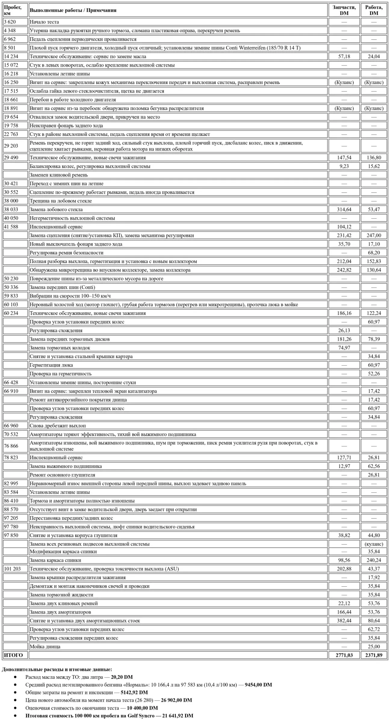 Его первое сцепление на пробеге 41 588 километров пало жертвой негерметичного сальника вторичного вала. Его заменили по доброй воле производителя (куланс). Но так как обычный автомобилист на 100 000 километрах в любом случае должен рассчитывать на замену сцепления, мы включили стоимость замены в таблицу расходов. Столь же нормальным является срок службы передних тормозных дисков, которые после 60 000 километров стали грубыми и волнистыми. Менее нормальным нам показалось протекание люка, которое случилось — вот уж ирония — именно на автомойке. Мы с радостью вспомнили времена, когда Джерри Льюис и Луи де Фюнес растягивали такие сцены на целые фильмы, да и заправщик знатно повеселился, глядя на свежевымытого и намыленного редактора. Какими бы удобными ни были спортивные сиденья VW, серийный руль нам настолько же не нравился. Его поверхность на ощупь слишком уж напоминает «нефтепродукты позднего сбора», так что настала очередь руля Genti, модель Imola. Он выступает чуть дальше в салон, чем оригинал, превосходно дополняет посадку, на ощупь — как благородная кожа дружелюбного КРС и всегда доставлял нам много радости при рулении.