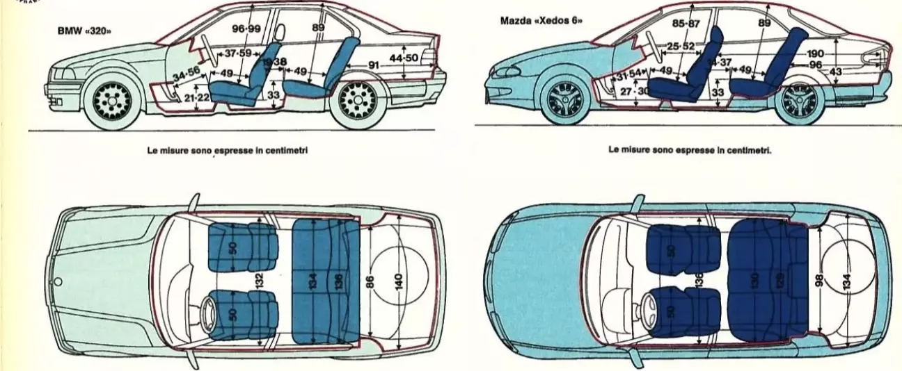 Седаны это или «четырехдверные купе»? Замеры салона MAZDA XEDOS 6 и BMW 320 практически не оставляют места для двусмысленности, особенно в случае с японской машиной. Даже делая скидку на наличие люка (опция), который неизбежно съедает полезную высоту над передними седоками, нельзя не заметить, что свободное пространство здесь ограничено необходимым минимумом. По сравнению с BMW линия крыши здесь ниже на целых 12 сантиметров; это существенная разница, которая на практике для рослых людей означает выбор между тем, задевать потолок головой или нет.