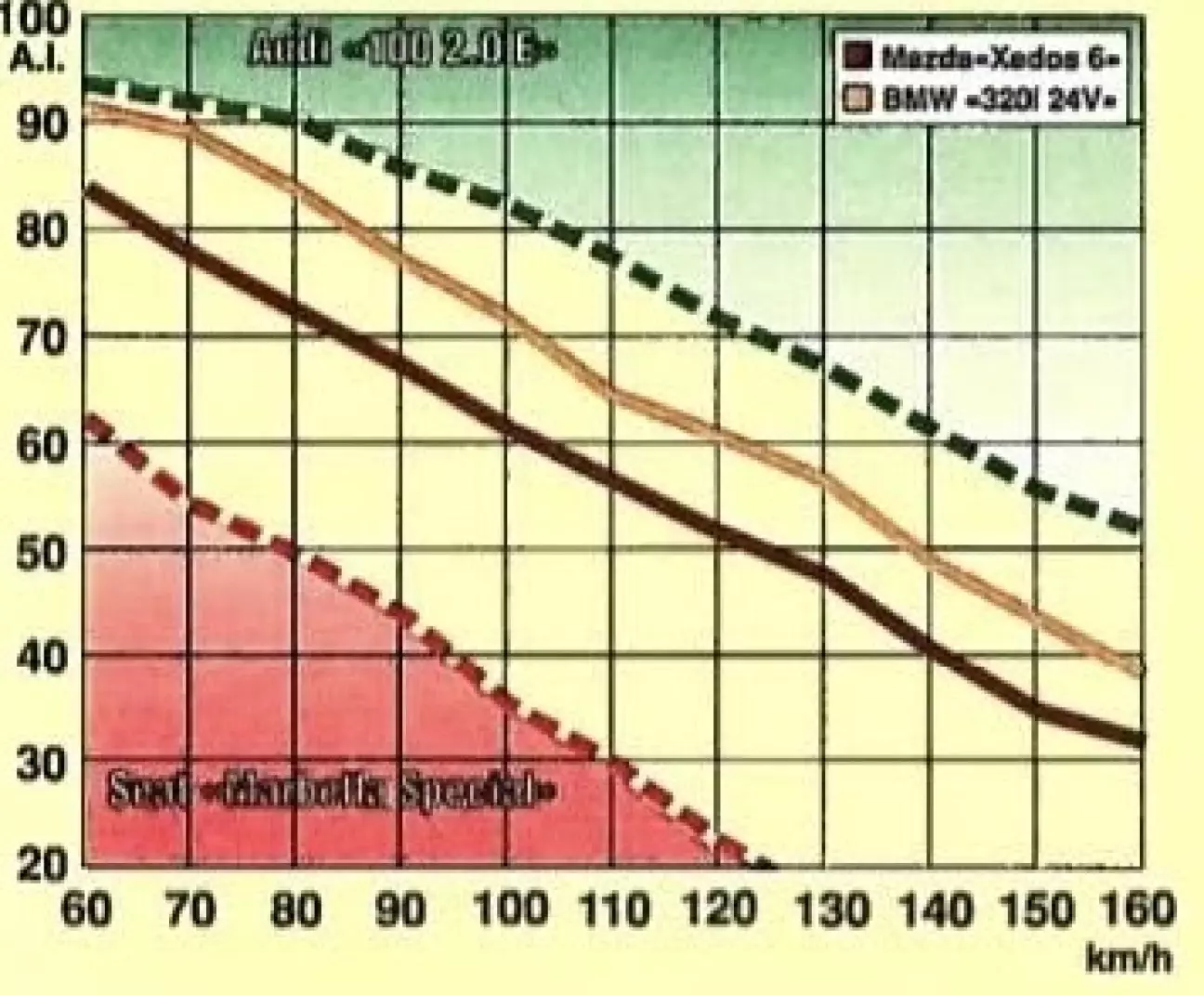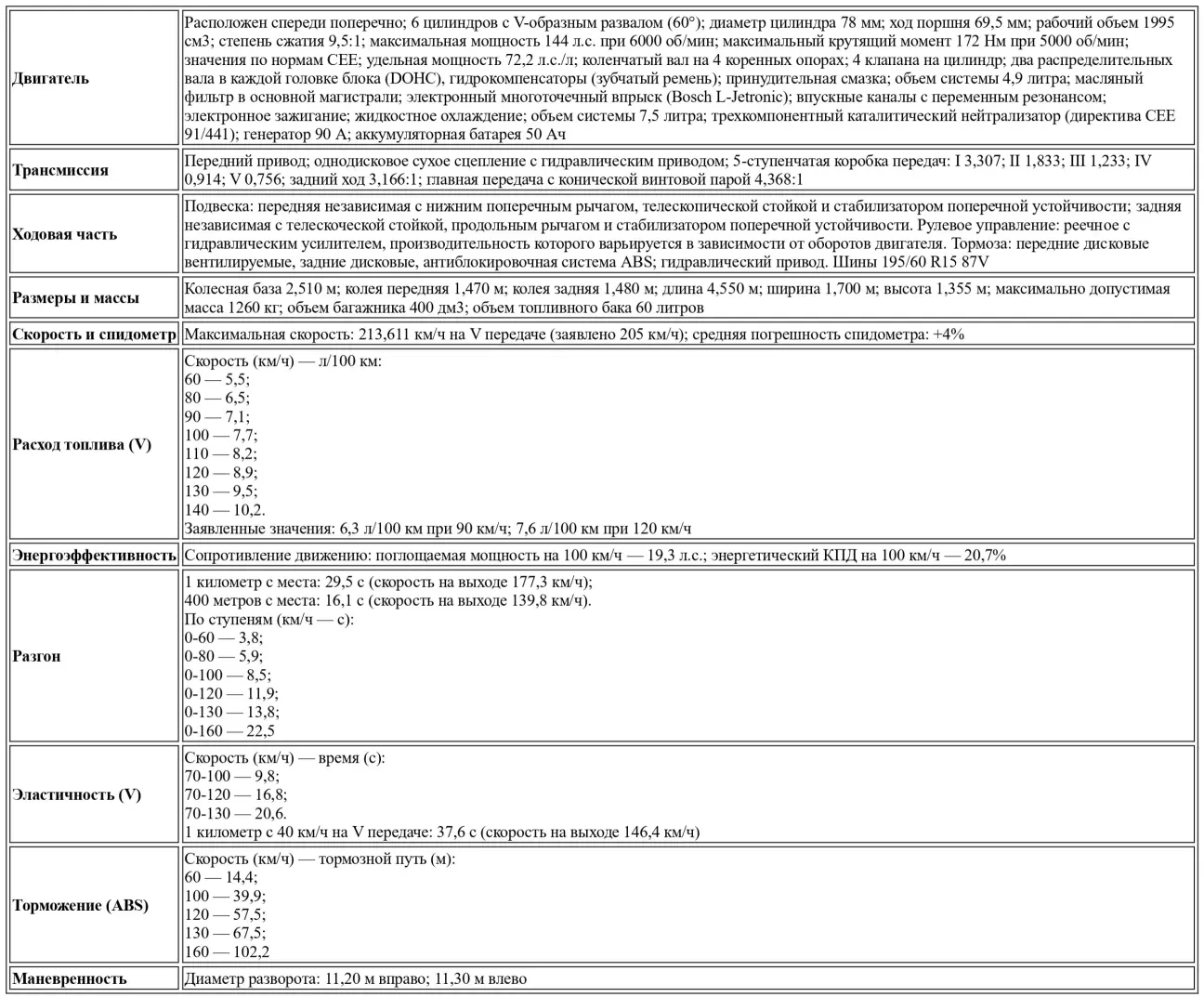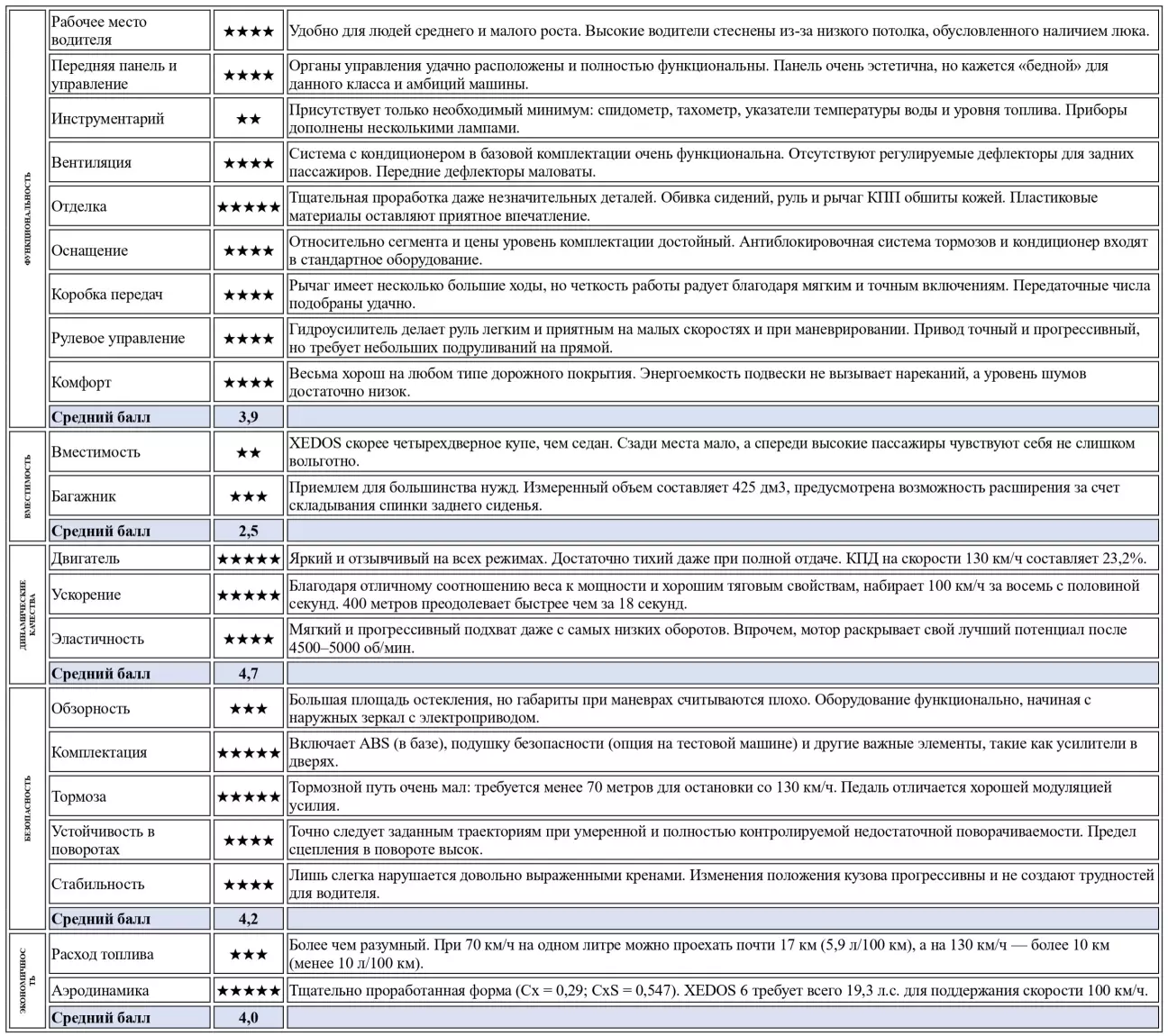 В целом, на XEDOS 6 можно совершать длительные поездки, не чувствуя усталости. Заслуга в этом принадлежит и отличной системе кондиционирования, которая, не будучи слишком сложной (она не автоматическая и не имеет дефлекторов для задних пассажиров), гарантирует достойный климатический комфорт. Говоря об удобстве, нельзя забывать и о вкладе мелких аксессуаров, кажущихся незначительными, но весьма полезных на практике: электропривод зеркал, подсветка порогов в дверях, корректор фар и так далее. Возвращаясь к дорожным манерам XEDOS 6, следует подчеркнуть чувство высокой безопасности, которое машина внушает водителю — не только благодаря эффективным тормозам (со 130 км/ч она останавливается менее чем за 70 метров) с поддержкой ABS, но и за счет легкости контроля. Водитель всегда остается хозяином положения, при этом от него не требуется каких-то особых навыков пилотирования. В повороте машина точно следует заданной траектории, несмотря на умеренную недостаточную поворачиваемость, и быстро стабилизируется, когда ее провоцируют резким движением руля или экстренным торможением перед препятствием.