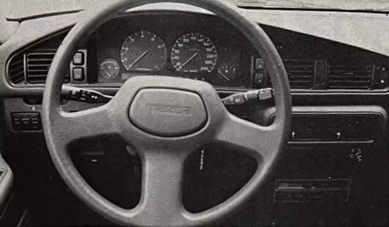 Здесь эта 626 GTi вступает в противоречие со своим шильдиком! Ведь инструментарий ограничен самым необходимым: спидометр, тахометр, указатель температуры охлаждающей жидкости и указатель уровня топлива, все это дополнено логичным и разумным набором контрольных ламп. Органы управления расположены удобно, под рукой, за исключением кнопки и индикатора обогрева заднего стекла, скрытых за спицами руля. Индикатор настолько крошечный, что его не видно днем, и он слишком незаметен ночью. К счастью, Mazda предусмотрела его автоматическое выключение при выключении зажигания. Поэтому упрек будет более серьезным в адрес заднего противотуманного фонаря, который, обладая теми же недостатками, что и обогрев, не выключается автоматически.