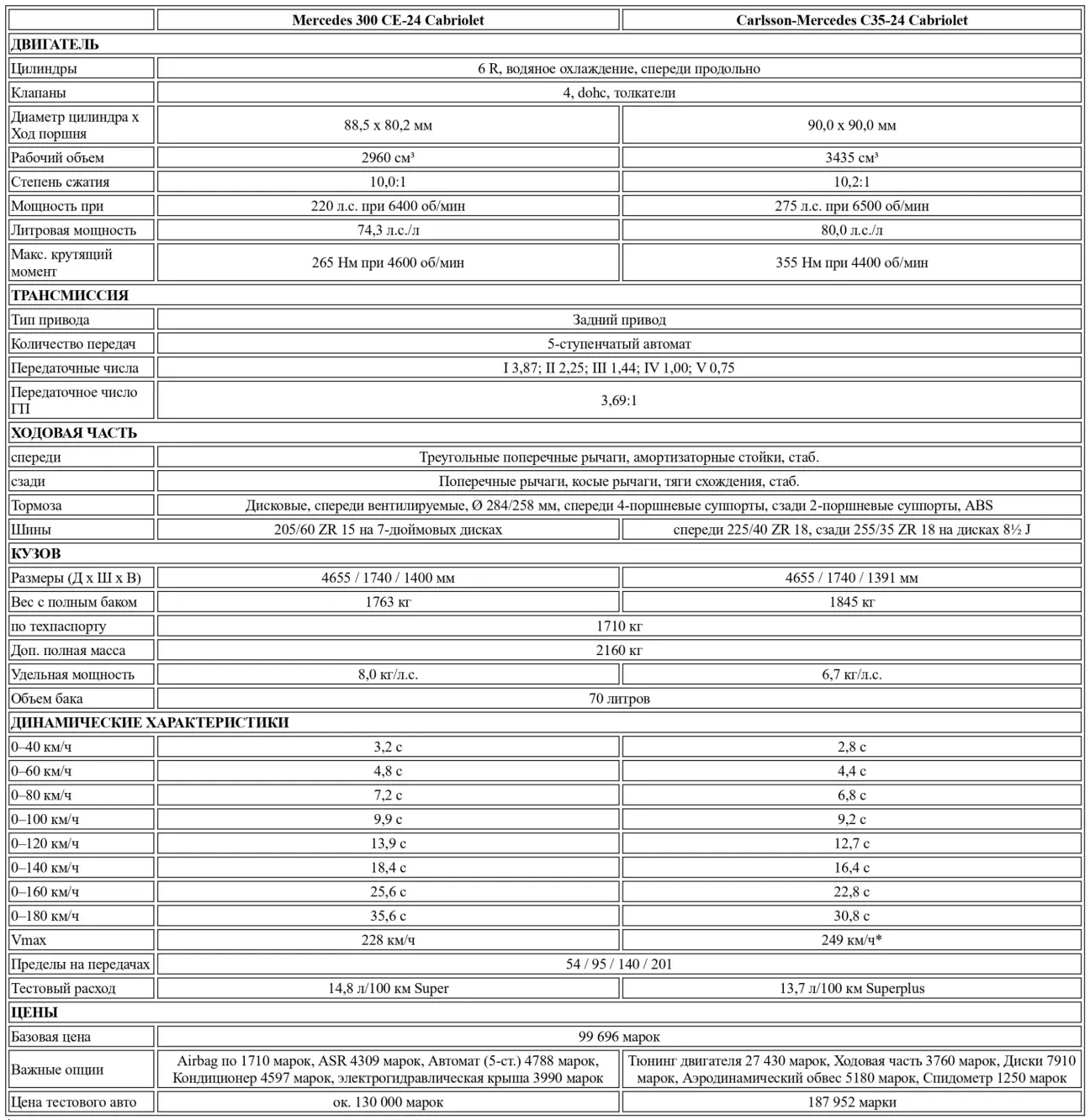 Перевод теста-сравнения Mercedes A124 Carlsson C35-24 Cabrio vs Mercedes A124 300 CE-24 Cabrio от немецкого автомобильного журнального издания Sport Auto, № 09, 1992.