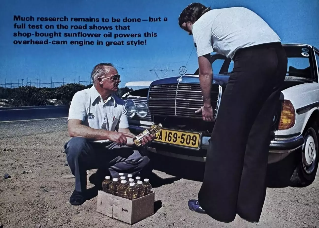 «Мы начали со стендовых испытаний, и, честно говоря, поначалу были настроены весьма скептически», — рассказал господин Джексон редакции CAR. — «Но мы получали один приятный сюрприз за другим: подсолнечное масло (на том этапе обычного магазинного сорта) оказалось совместимым и смешиваемым как с дизельным топливом, так и с моторным маслом, хотя и обладало гораздо более высоким индексом вязкости. Следующим этапом стали дорожные испытания. Я решил использовать собственный Mercedes 240D Automatic 1977 года выпуска с пробегом чуть более 50 000 км. Машина шла идеально, но на следующее утро наотрез отказалась заводиться «на холодную» на этом растительном масле. Мы перепробовали различные средства, такие как Start-Up, но пока так и не преуспели в холодном пуске на чистом подсолнечном масле. С прогретым двигателем — и в течение часа или около того после поездки — он заводится безупречно».