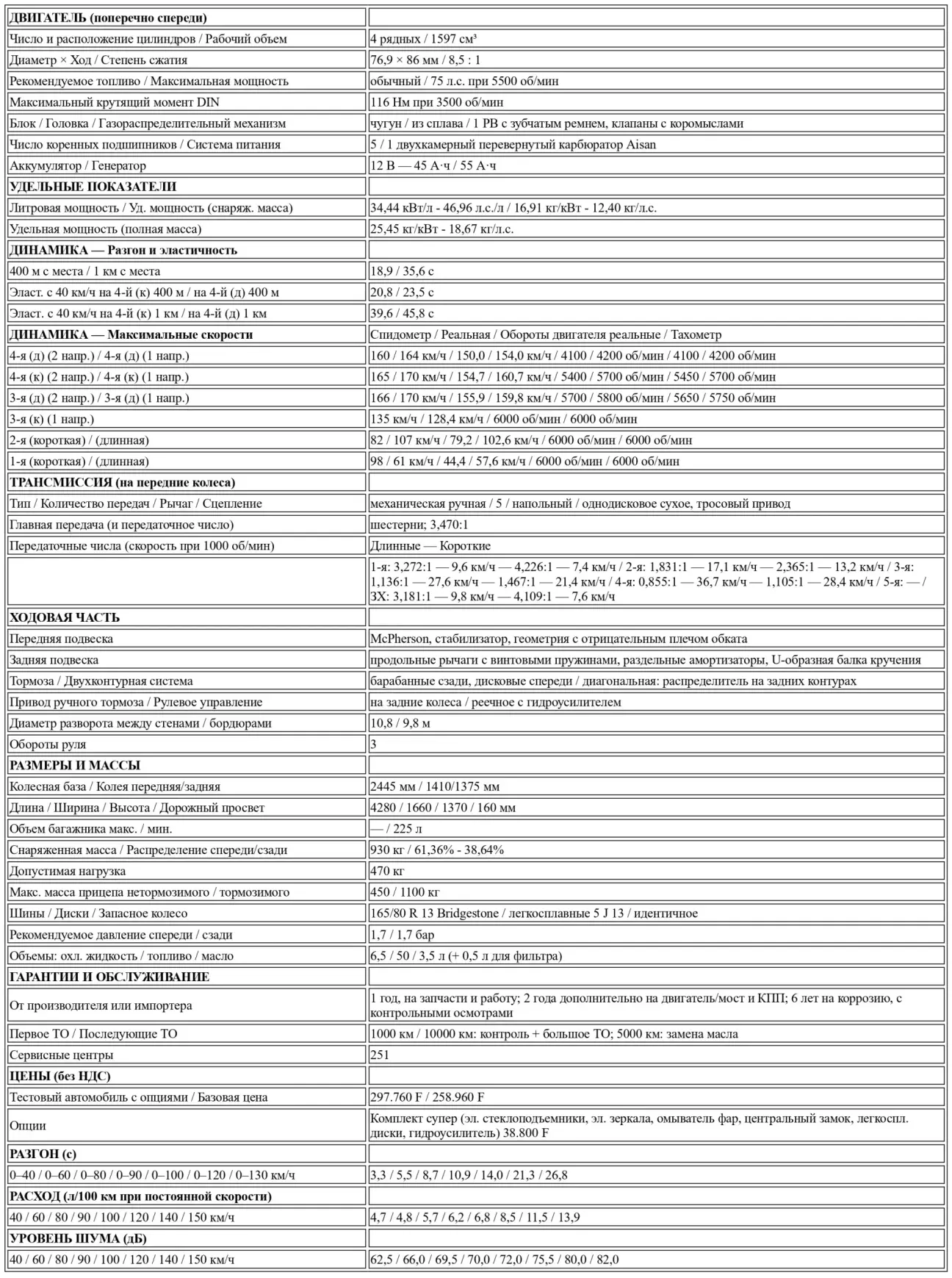 Максимальная скорость автомобиля вызвала у нас удивление. Мы полагали зафиксировать ее на высшей передаче в «коротком» ряду (простите за упрощение, используемое далее для удобства) — на четвертой «короткой». Но нет! Максимум был достигнут на третьей «длинной» передаче: среднее значение в двух направлениях составило 155,9 км/ч, а лучший заезд — 159,8 км/ч. В эти моменты двигатель крутился до 5700 и 5800 об/мин. На четвертой «короткой» мы приблизились к этим цифрам, показав 154,7 и 160,7 км/ч при 5500 и 5700 об/мин. На четвертой «длинной» наша Tredia — уже имевшая на одометре 8000 км — смогла развить лишь 149,7 и 154,0 км/ч при 4100 и 4200 об/мин. Все это не впечатляет и уж точно не доказывает совершенство кузова, а именно Cx, так как он является важнейшим фактором достижения высокой скорости при скромной мощности мотора.