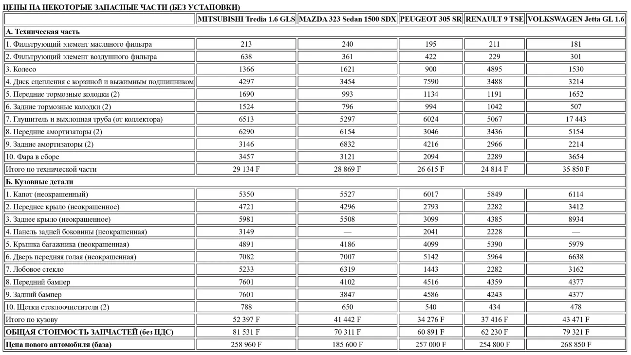 Согласно традиции, которой дорожит Mitsubishi (по крайней мере, для моделей, импортируемых на наш рынок), гамма обеспечивает логичный рост уровня отделки в прямой зависимости от обозначений и цен. Список опций сведен к минимуму, за единственным исключением — доступностью пакета super для Tredia 1600 GLS и 1600 GLS Automatic. Цены в линейке Tredia варьируются от 212 960 франков за 1400 EL до 340 000 франков за 1600 Turbo. Версия, которую мы представляем сегодня — Tredia 1600 GLS с пакетом super — продается по цене 297 760 франков (или 258 960 франков без этого дополнения). Тем не менее, данный пакет придает автомобилю солидный уровень комфорта, так как за сумму в 38 800 франков он включает электростеклоподъемники всех четырех дверей, два зеркала с электроприводом, омыватели и очистители фар, центральный замок, легкосплавные диски и гидроусилитель руля.