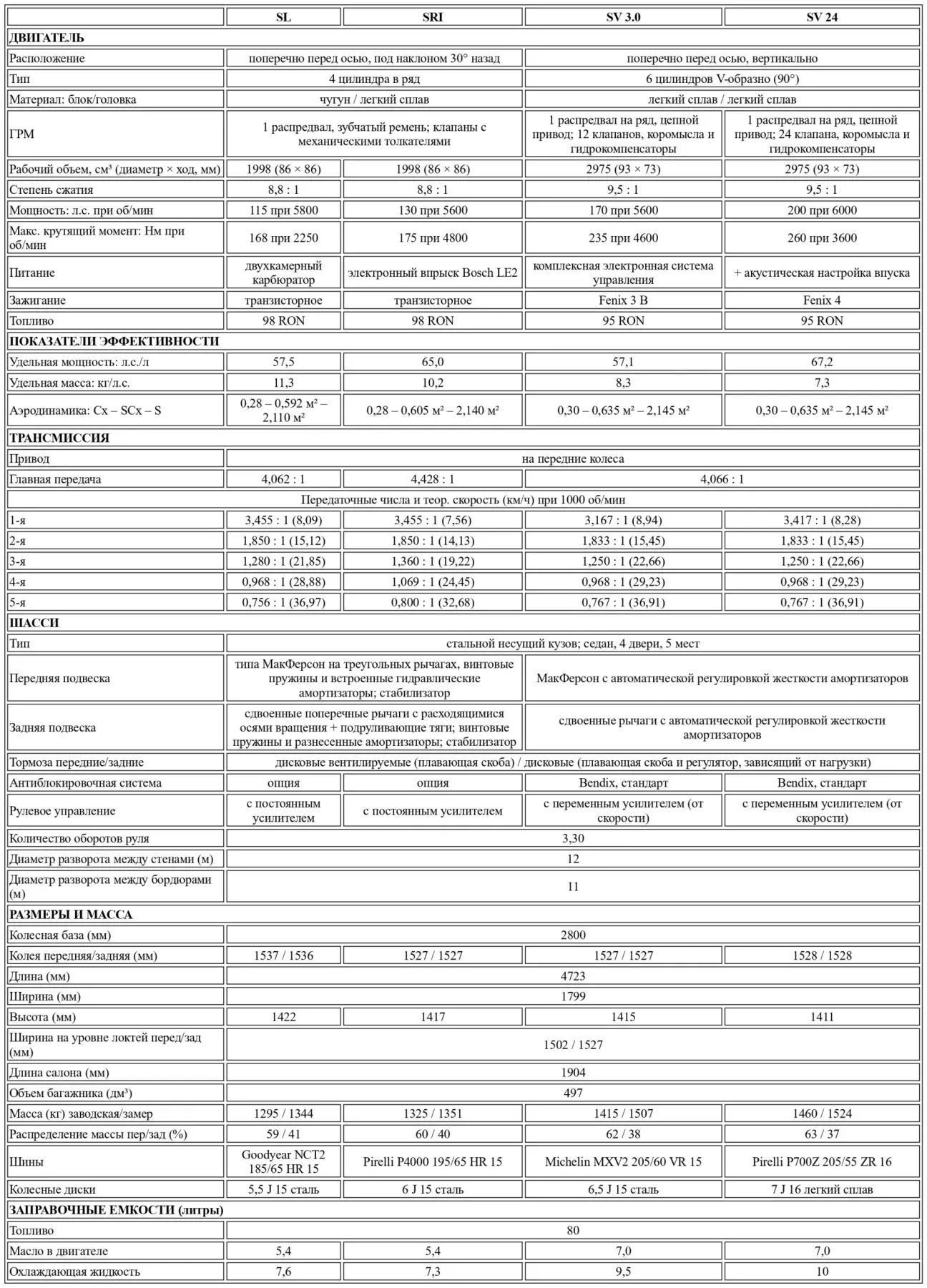 Зеркала на версиях SV электрические, тонированные и с обогревом. На SR они тоже с обогревом, но электрорегулировка только со стороны пассажира, тогда как SL довольствуется простыми зеркалами с тросовым приводом. Стеклоочиститель с двумя щетками в выключенном состоянии слегка прячется за кромку капота. Регулировка прерывистого режима есть начиная с SRI, предусмотрена защита системы при блокировке снегом или льдом. Водительская щетка оснащена широким антикрылом, обеспечивающим прижим на высоких скоростях. Омыватели фар доступны как опция только для SV, их форсунки сделаны выдвижными. Разумеется, все 605-е имеют центральный замок и передние электростеклоподъемники. На SV есть импульсный режим у водителя и задние электростекла. Наконец, 500-литровый багажник позволяет спокойно ехать в отпуск, но, как и у Mercedes, задний диван закреплен жестко, и придется довольствоваться лючком для лыж. Причем только SV 24 штатно комплектуется необходимым чехлом, позволяющим возить в салоне что-то помимо карнизов, не рискуя испачкать обивку.
