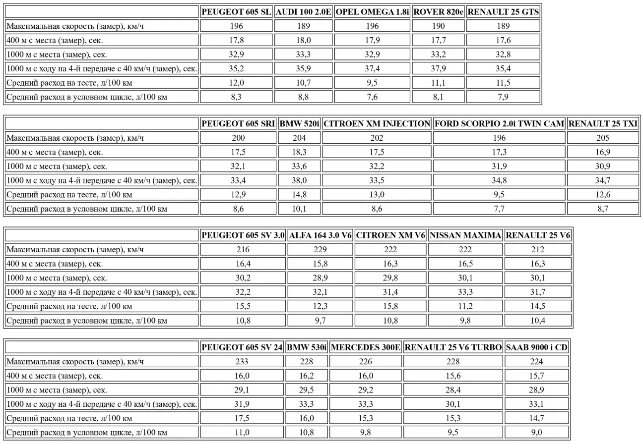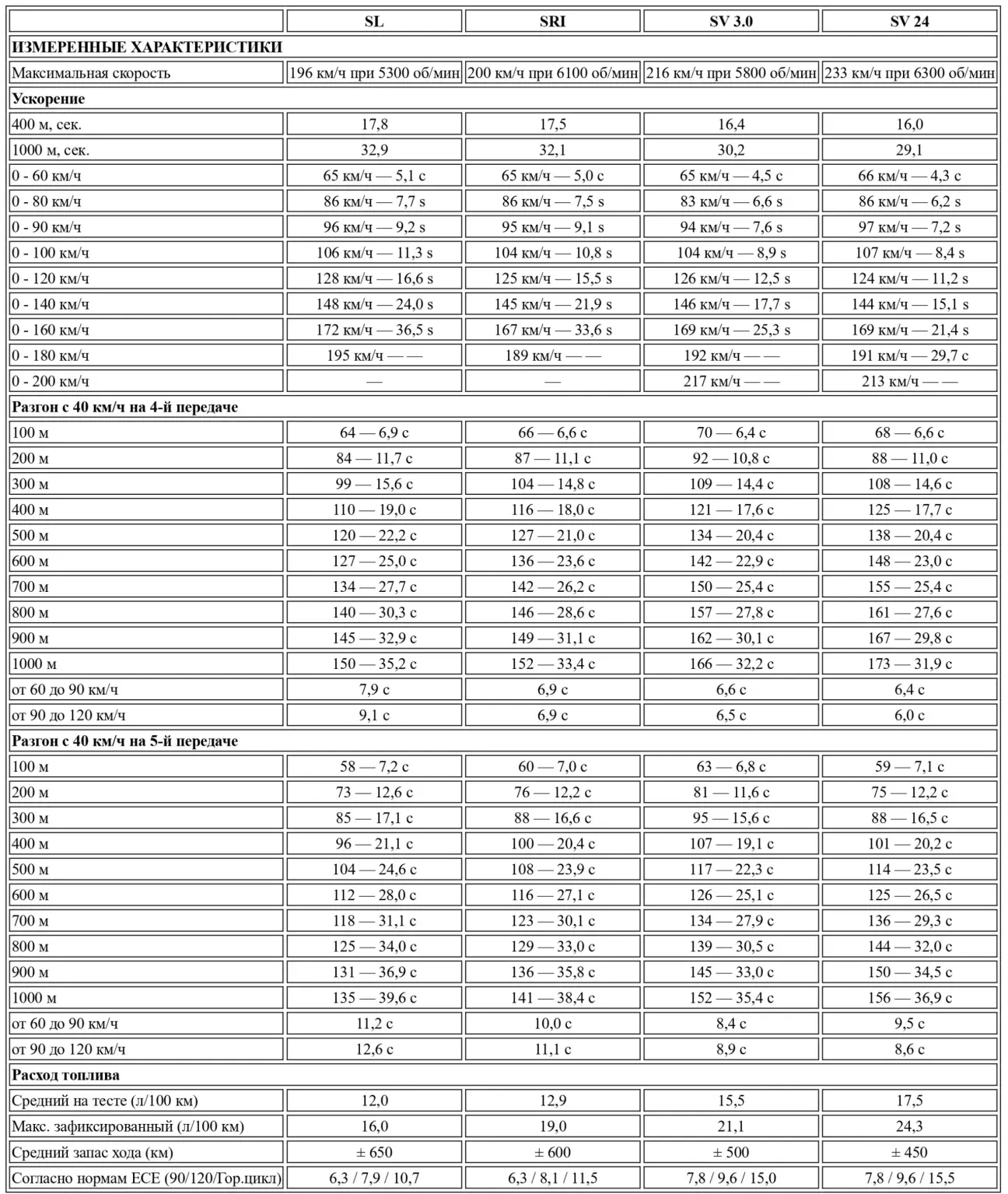 Учитывая факторы, влияющие на динамику, не стоит удивляться, что 605 SL и SRI оказываются довольно прожорливыми в городе и на сложном рельефе, но при этом весьма умеренны на открытых пространствах, если не злоупотреблять скоростью. В целом SL чуть более жаден до топлива, чем прямые конкуренты, тогда как SRI на фоне плохих результатов BMW 520i может претендовать на место в середине списка. Результаты версий V6 — ни хорошие, ни плохие, учитывая их уровень — являются вполне стандартными. Стоит отметить, что Alfa 164 и Nissan Maxima, представленные в наших таблицах конкурентов, испытывались не в тех же условиях, что SV 3.0, XM V6 и 25 V6. С другой стороны, мы получили 16,0 л/100 км на BMW 530i на маршруте, аналогичном тому, что проехали на SV 24. Это объясняет, почему мы не стали приводить цифру 13,2 л/100 км из детального теста месячной давности.