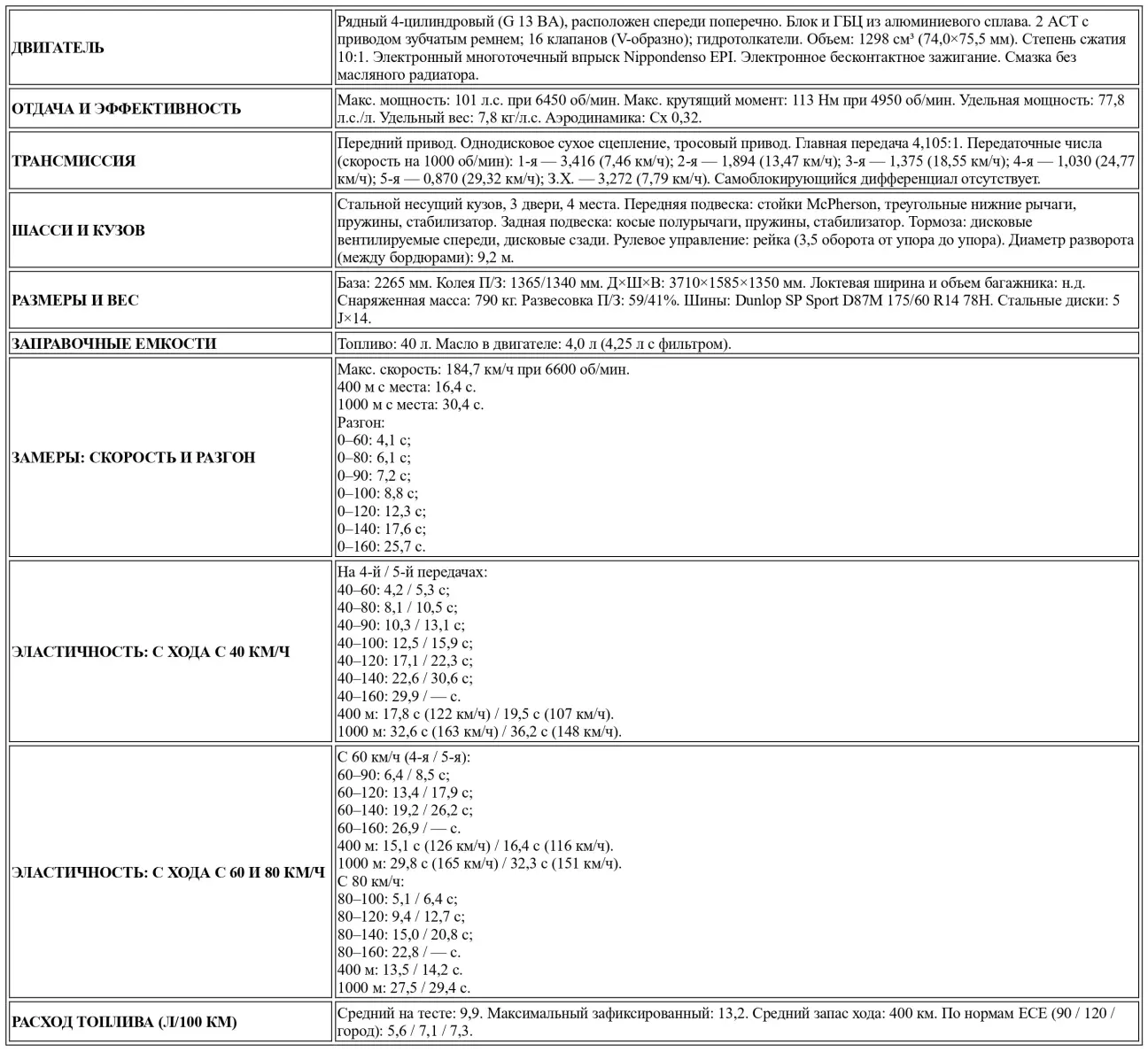 Шаг за шагом Swift GTI превратился в настоящий маленький спорткар. Японский ремейк появления британского Cooper S? Предыдущая модель уже скрывала драгоценность под заурядным капотом: цельноалюминиевый четырехцилиндровый блок, чья «головка» по-прежнему тянет на 16 карат. В переводе на технический язык — четыре клапана на цилиндр и изощренная цифровая система управления. Этот «кубик» объемом менее 1300 см³ выдает честные 101 л.с., что обеспечило Swift достойное занятие — соревнования (группы А и N). Но до сих пор он был привинчен к серийному шасси, которое явно не соответствовало его уровню; поэтому инженеры из Хамамацу поработали над кинематикой подвесок — отныне их направляющий аппарат включает в себя нижние треугольные рычаги, — а также выбрали путь удлинения колесной базы (+ 20 мм) и расширения колеи (+ 30 мм спереди, + 40 мм сзади). Не стоит забывать и о том, что наш маленький черный болид получил более солидную «обувь»: шины Dunlop D87 размерностью 175/60 R14 вместо скромных D67 165/65 R13 в прошлом. Вот почему он становится «черным грибком на асфальте», не превращаясь, однако, в бедствие. Немного похоже на наддувный Daihatsu Charade GTti той же мощности (трехцилиндровый мотор 993 см³), более квадратный в плане пятна контакта, с шасси, лучше снабженным резиной, но с менее строгим направляющим аппаратом. И не более быстрый в эластичности, несмотря на помощь турбины. К слову, лучшие результаты, полученные в ходе замеров разгона на 400 и 1000 метров с места, составили на Suzuki 16,2 и 29,8 сек. соответственно против окончательных 15,9 и 29,7 сек. у GTti. Таким образом, перед нами породистый болид: при усреднении замеров в двух направлениях — 16,4 и 30,4 сек. — те же отметки 400 и 1000 метров Suzuki преодолел, пролетая мимо них на скорости 135 км/ч, а затем 166 км/ч «реальных» соответственно.