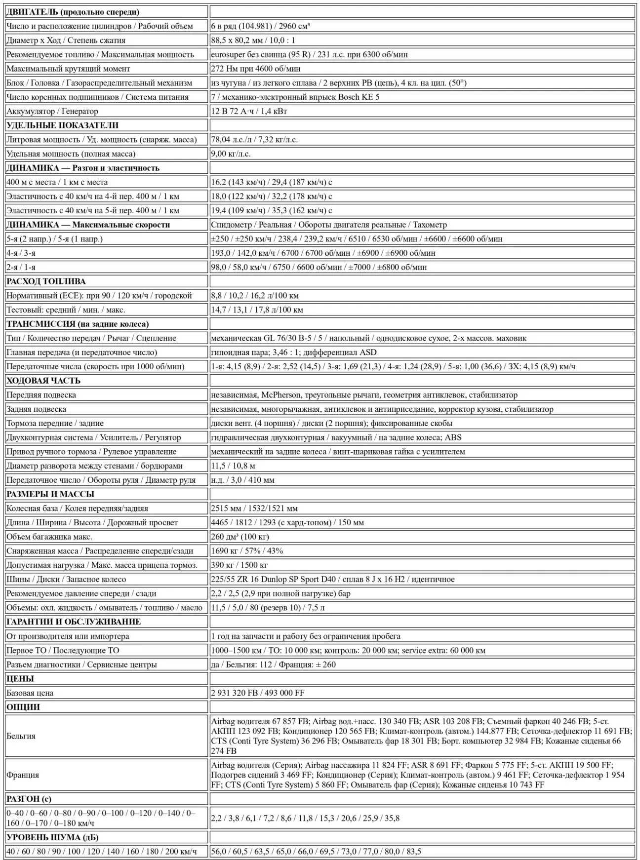 Еще одна «премьера» для SL, хотя это и не является строго обязательным для автомобиля спортивной направленности, заслуживает пары слов пояснения, поскольку наша тестовая машина не была ею оснащена: речь об ADS. Нет-нет, мы не допустили орфографической ошибки! Вслед за ABS (антиблокировочная система), ASD (самоблокирующийся дифференциал с электронным управлением) и ASR (антипробуксовочная система), Mercedes внедряет на SL систему ADS в сочетании с RNR (автоматический регулятор дорожного просвета). ADS — это система демпфирования, которая автоматически адаптирует жесткость амортизаторов к условиям движения (состояние дороги, скорость, нагрузка и т.д.) по четырем уровням, предлагая наилучший компромисс между комфортом и активной безопасностью. Однако в прайс-листе Mercedes во Франции эта опция (пока!) не значится, тогда как в Бельгии она предлагается за «скромную» сумму в 173 592 бельгийских франка со всеми налогами... Заметим, что поначалу ABS тоже стоила недешево, а сегодня она входит в стандартную комплектацию всей гаммы Mercedes и многих автомобилей других марок! Говоря о серийном оснащении, отметим также усилия, которые прилагает Mercedes для лучшей базовой комплектации своих машин и сокращения списка опций. Несмотря на небольшие различия в политике французских и бельгийских импортеров (первые поставляют в базе омыватели фар, а также подушку безопасности для водителя и кондиционер; вторые — подогрев передних сидений), модели SL оснащены в базе особенно хорошо, и тем более 500 SL с 32-клапанным двигателем, нежели 300 SL-24 (объект данного теста) или 300 SL (не представленный во Франции), но справедливости ради, цена, запрашиваемая за эти изделия, требовала определенных «жертв» со стороны трехлучевой звезды...