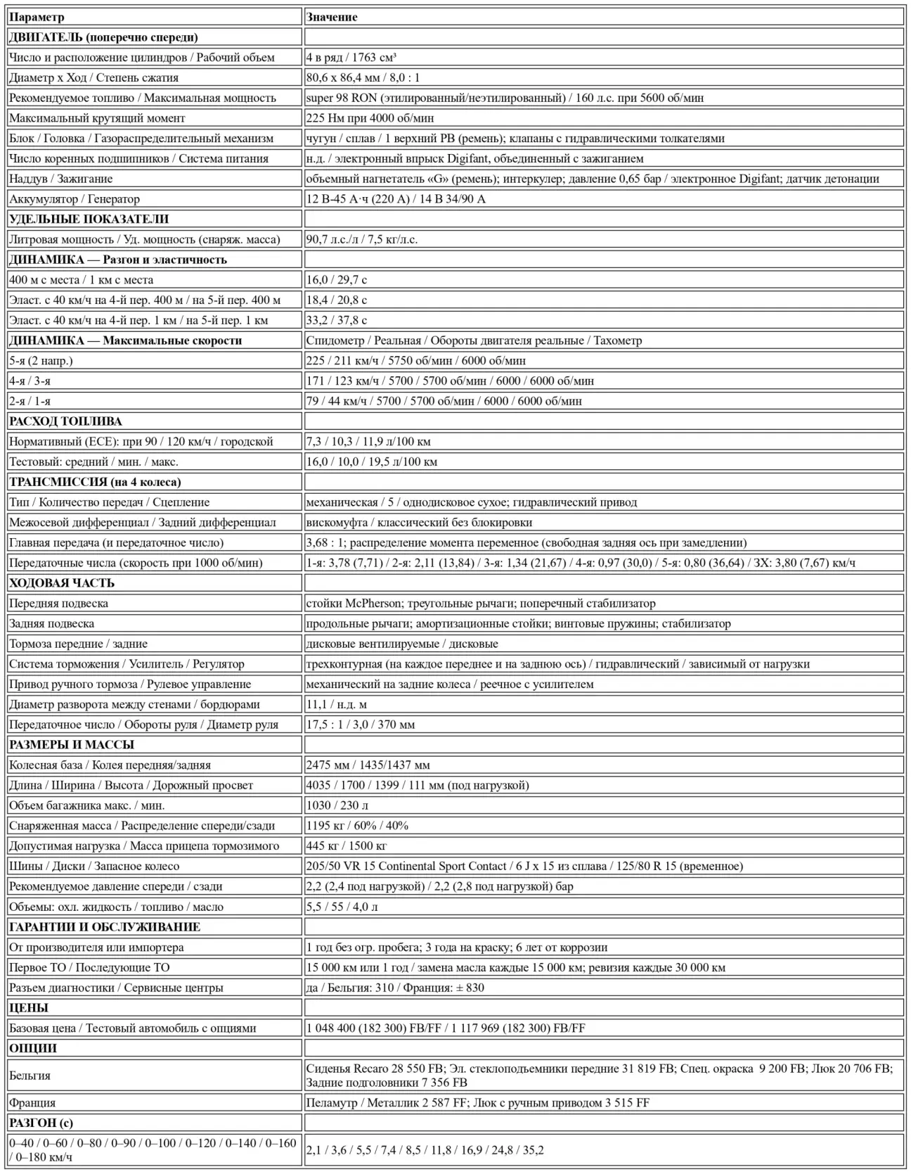 Нет смысла вдаваться в детали: с максимальной скоростью 211 км/ч, а также 16,0 и 29,7 секундами на 400 и 1000 метрах с места, Golf Rallye безнадежно отстает от выбранных нами конкурентов и оказывается в рядах обычных GTI. Чуть менее быстрый «в максималке» (замеренные 204 км/ч), Golf 16S фактически на равных спорит с Rallye в разгоне (15,9 и 29,4 с на 400 и 1000 м с места соответственно). Ситуация не исправляется и в дисциплине «эластичность», где, вопреки многочисленным аргументам создателей компрессора, G60 всё еще заметно уступает 16-клапаннику, который и сам не является эталоном в подобных упражнениях.