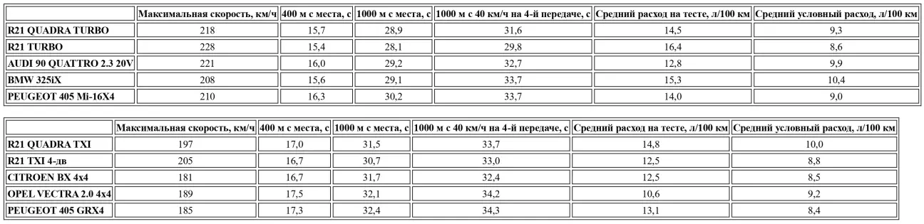 Логично было опасаться, что лишний вес и инерция полного привода «задушат» динамику. Но это не учитывало щедрость турбомотора, с одной стороны, и остроумно подобранные новые передаточные числа коробки нового TXI — с другой. Имея менее 29 секунд на километре с места и 218 км/ч максимальной скорости, Turbo Quadra остается в числе самых быстрых седанов момента, в конечном итоге уступая лишь малую долю пространства переднеприводному Turbo. По сравнению с последним большая разница проявляется на старте: больше нет нужды в изощренном упражнении с пробуксовкой. Единственная ошибка, которую еще можно совершить, — это «сжечь» сцепление: колеса же упорно отказываются буксовать. Где этот «простой R21 с семейной внешностью» превосходит всех еще больше, так это в эластичности: 31,6 секунды на 4-й передаче — это время даже лучше, чем у последней Delta Integrale Turbo 16V. BMW 325iX и прочие Peugeot 405 Mi-16 x4, не выдерживая сравнения в плане момента и Нм, безнадежно отстают. При условии, что двигатель поддерживается на высоких оборотах, выше 4000 об/мин, TXI доказывает, что у него есть ресурсы, достойные «140 сил». Ниже этого порога разочарование в доступной тяге довольно велико. По крайней мере, этому 2-литровому мотору не занимать ни деликатности, ни гибкости. Поскольку система Quadra могла только усугубить этот недостаток эластичности, Renault нашла удачное решение, выбрав более короткие передачи в угоду набору оборотов и, следовательно, эластичности: 33,7 секунды на километре с хода на 4-й передаче — это действительно совсем неплохо. BMW 325iX не показывает лучшего результата. Конечно, в чистой динамике и скорости отношение вес/мощность и инерция системы 4х4 (которая, впрочем, проходит довольно незамеченной) диктуют свои законы: 197 км/ч в пике, 31,5 секунды на дистанции 0–1000 метров и 10 секунд на 0–100 км/ч. Оставаясь ниже показателей переднеприводного TXI, но в процентном соотношении меньше, чем между BMW 325i и её полноприводным аналогом X, результаты TXI доказывают, что этот семейный седан остается в любых обстоятельствах маневренным и приятным в управлении. Он никогда не производит впечатления обремененного своим весом... или своей системой Quadra.