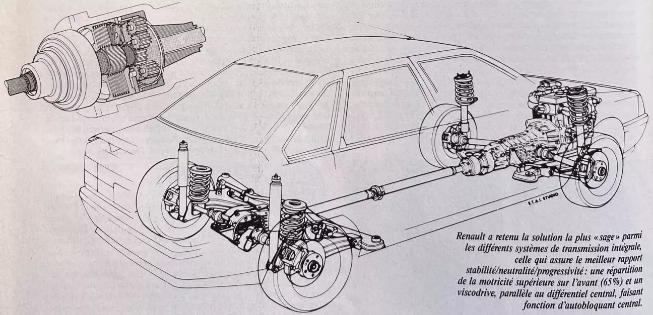 Это длинное вступление позволяет нам напомнить о роли «балансировки» и «стабилизации», которую выполняет полный привод, что идеально высветилось с появлением Porsche 911 Carrera 4: вместо того чтобы просто улучшить эффективность тяги, и без того отличную на заднеприводном 911, он преобразил изначально резкий и острый характер машины, придав ей прогрессивность, баланс и нейтральность реакций, невообразимые до тех пор. На семейном автомобиле эта динамическая, корректирующая и, в конечном счете, активная функция значительно обезопасит и «разгрузит» водителя, обычно мало смыслящего в пилотировании, когда климатические условия и сцепление с дорогой ухудшаются. И именно на этот существенный вклад в активную безопасность нацелена Renault в своих R21, «машинах для жизни» (но не опасной), устанавливая самое «рассудительное» решение из всех: распределение тяги с приоритетом на переднюю ось (65% перед / 35% зад) и вискомуфту Viscodrive параллельно межосевому дифференциалу, выполняющую функцию центральной самоблокировки. На первый взгляд, такое распределение мощности (оправданное также перевесом массы на переднюю часть R21 с продольным двигателем) заставляет предположить поведение, очень близкое к переднеприводному: разве это не то, что больше всего успокаивает большинство водителей?
