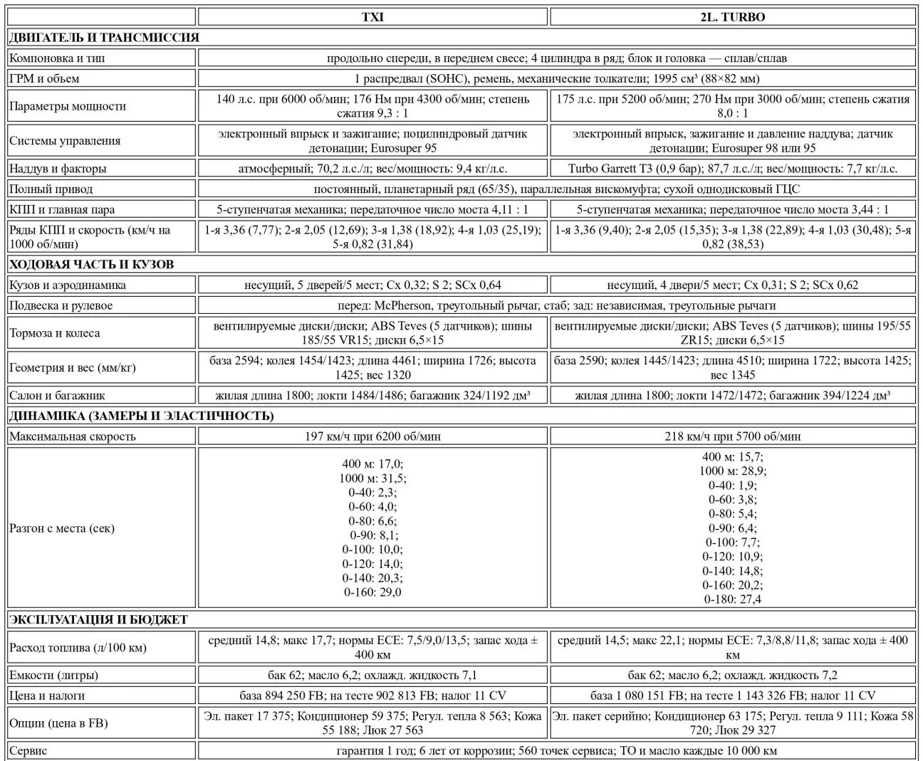 Зато на заправке присутствие системы Quadra и влияние «короткой» трансмиссии, постоянно держащей двигатель «в тонусе», ощущаются на TXI больше всего: в среднем почти 15 л/100 км. В 89-м году в это верится с трудом, и тем не менее! Нужно рассчитывать на 10–12 литров на каждые 100 километров, проявляя огромную осторожность и при условии, что городских маршрутов будет немного. Городской цикл превосходит всякое воображение в семействе 2-литровых инжекторов: отметка 16 л/100 км преодолевается совершенно непринужденно. При активной езде расход подскакивает до 17–18 л/100 км. Устрашающе. Турбомотор же едва замечает, что ему приходится тянуть полноприводную трансмиссию, тем более что коробка сохранила те же числа. Следовательно, он потребляет в тех же «пропорциях», что и переднеприводная версия: много при нагрузке, умеренно мало при нормальной езде, учитывая его потенциал. Со средним расходом 14 л/100 км за рулем невозможно заскучать. При 13 л/100 км даже позволено ехать по автостраде, не слишком обращая внимание (вы понимаете, что я имею в виду).