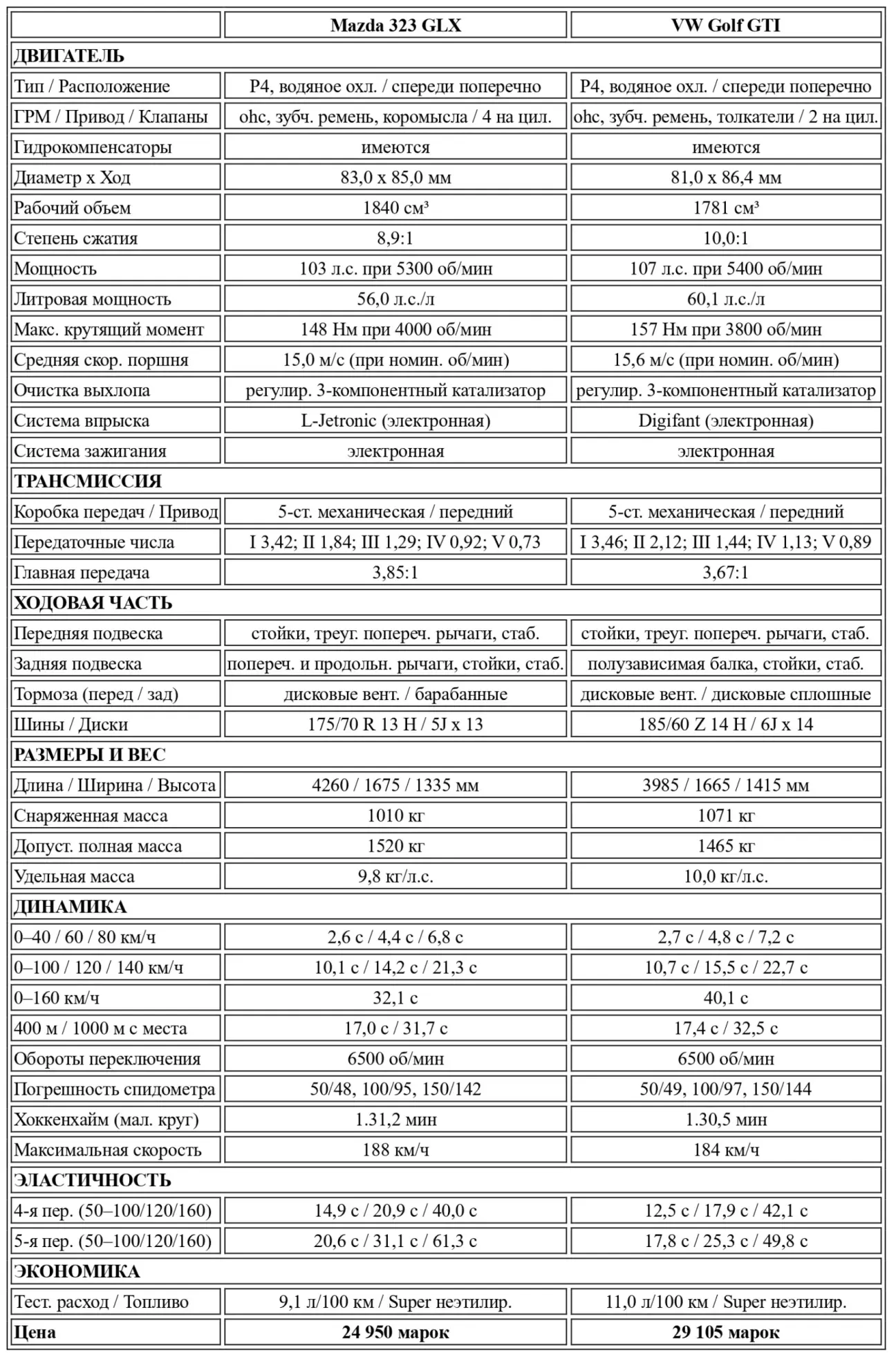 Их развитие шло практически в противоположных направлениях. GTI с самого начала планомерно выстраивал для Golf имидж бескомпромиссного спорткара. С 1976 года с конвейера сошло в общей сложности 900 000 экземпляров GTI. Однако со сменой поколений острые грани заметно округлились, и второй Golf ощутимо сместил акценты в сторону семейного автомобиля. Появившаяся позже Mazda 323, получившая передний привод лишь в 1980 году, во второй фазе своего развития с 1985 года эволюционировала из скромной тележки для поездок за покупками в элегантный пятидверный хэтчбек со спортивными купейными нотками. В пику Golf GTI амбициозные японцы выставили свою Mazda 323 GLX, которая не дает поводов для критики ни в технической концепции, ни в плане оснащения. В ценообразовании же она выдерживает почтительную дистанцию, чтобы мягко самортизировать преимущество в популярности нынешнего отличника класса.