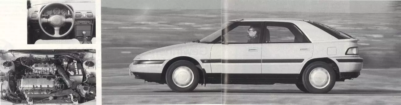 Так, стратеги Mazda наделили свою машину не конструктивно заурядным двухклапанником, как у Golf, а почти равным ему по отдаче шестнадцатиклапанным мотором с легкосплавной головкой и чугунным блоком цилиндров. Впускные и выпускные клапаны расположены под углом 40 градусов, что позволило придать камере сгорания шатровую форму. Один верхний распределительный вал управляет клапанами через коромысла. Двигатель Mazda достигает пика мощности уже при 5300 об/мин и демонстрирует исключительно ровную полку момента (максимум 148 Нм при 4000 об/мин). Очевидным приоритетом при разработке были хорошая тяга, низкий расход топлива и малый уровень шума. Поэтому инженеры Mazda уделили особое внимание газодинамике. Так, они оснастили свой многоклапанник системой изменения длины впускного тракта. По аналогии с Opel Omega 3000 24V или Toyota Supra, заслонка в зависимости от оборотов открывает дополнительный резонансный объем во впуске.