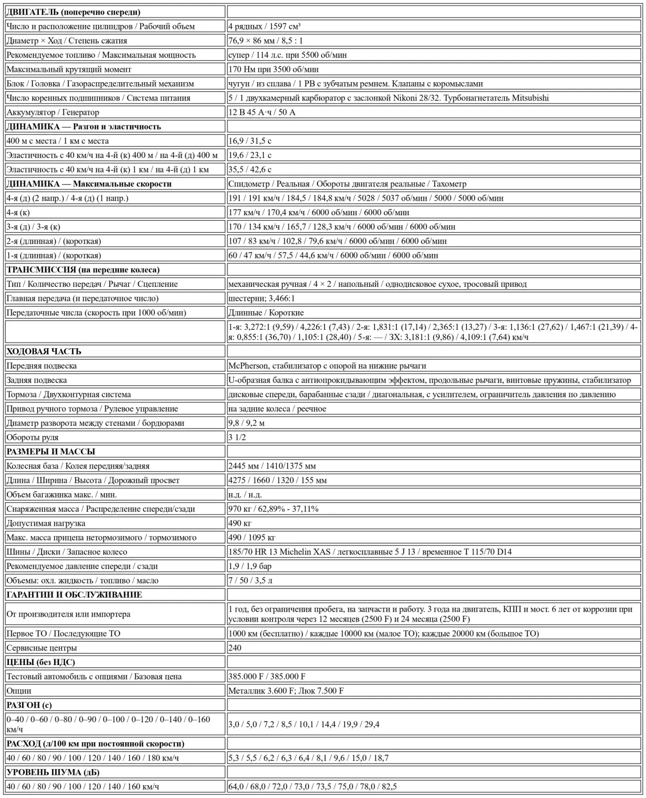 Что касается расхода топлива, то здесь официальных данных больше. Заявлено, что аппетит близок к показателям атмосферного мотора. Наши замеры подтвердили эти данные: 6,3 л/100 км при 90 км/ч (6,1 по заводу), 8,1 л/100 км при 120 км/ч (8,1 по данным Mitsubishi) и 9,6 л/100 км в городе (официально 9,3). Это означает, что Mitsubishi Cordia Turbo может оставаться благоразумной, но для этого требуется содействие водителя. График расхода на установившихся скоростях весьма показателен: он подтверждает вступление в работу второй камеры карбюратора, но после 145 км/ч кривая резко идет вверх, достигая 19 л/100 км на максимальной скорости 184 км/ч. Турбокомпрессор ответственен за этот значительный рост, подтверждая свою эффективность языком цифр. Это также объясняет наш средний расход, который за все время теста зафиксировался на отметке 14,35 л/100 км с крайними значениями 10,3 и 16,1 л/100 км. При полном ускорении Cordia Turbo потребовала 299 см³ топлива, что соответствует условному расходу 29,9 л/100 км — цифра весьма красноречивая.