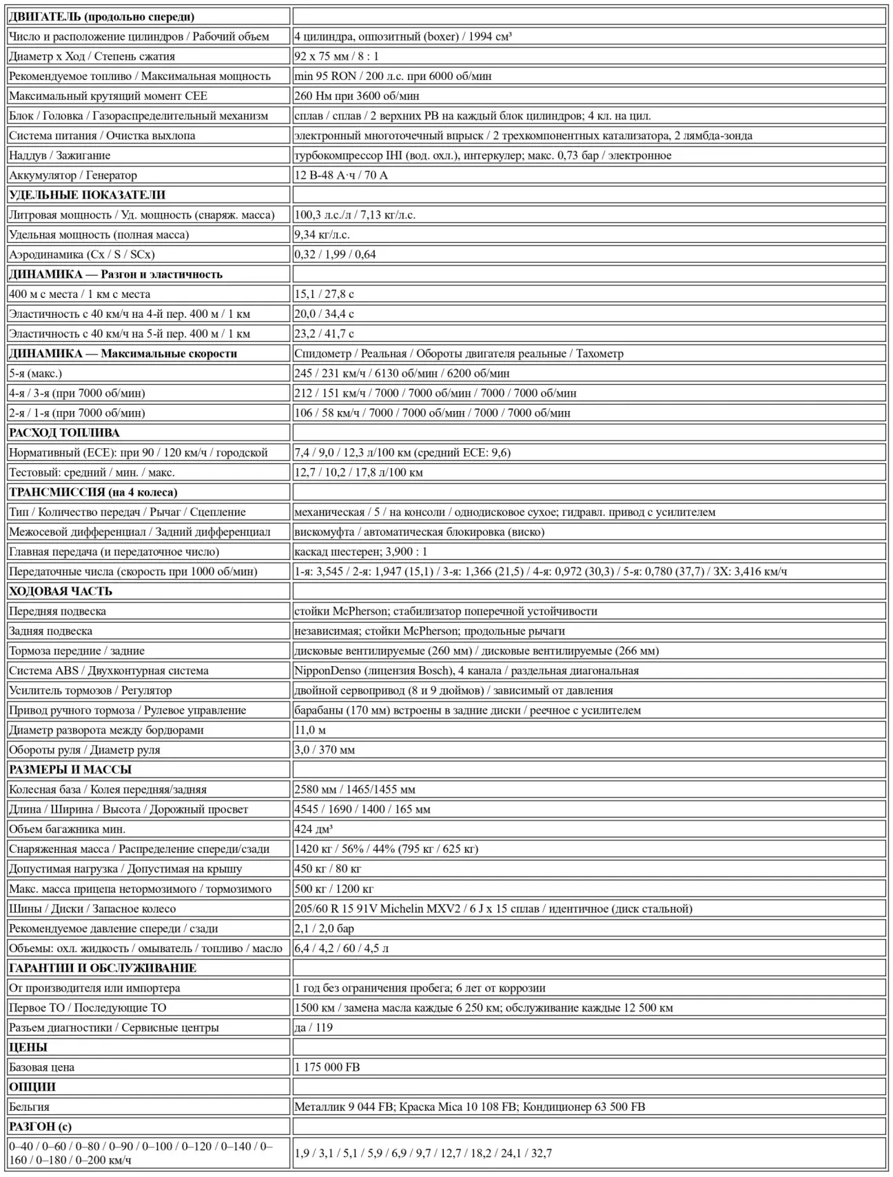 Технически Subaru Legacy 2.0 Turbo 4WD базируется на той же платформе, что и остальные модели линейки. Legacy уже была объектом двух детальных тестов: один касался версии 2.2 GX 4WD (№ 946), другой — модификаций 1.6 и 1.8 с моноприводом (№ 973). Появление версии с наддувом совпало с выводом на рынок атмосферного двухлитрового мотора, занявшего нишу между агрегатами 1.8 и 2.2. Приход этой спортивной версии на европейский континент сопровождается легкой ретушью всей гаммы, затронувшей преимущественно переднюю и заднюю части кузова. Различия между «спортсменкой» и остальным семейством Legacy минимальны. Самые заметные элементы — это передний спойлер с интегрированной парой круглых противотуманных фар, развитая прорезь воздухозаборника на капоте, антикрыло на крышке багажника и 15-дюймовые легкосплавные диски. В интерьере взгляд прежде всего цепляется за ковшеобразные сиденья и руль Momo. Через несколько месяцев к седану присоединится универсал с высокой крышей, получивший название Touring Wagon. Поскольку он не попадает под налог на роскошь, которым облагаются автомобили мощнее 116 кВт (158 л.с.) или объемом свыше 3 литров, его цена на 40 000 бельгийских франков ниже, чем у аналогичного седана.
