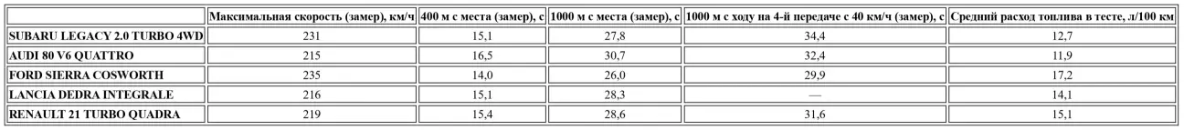 От седана со столь буржуазным имиджем и неброской внешностью, к тому же не носящего престижной фамилии, не ждешь выдающихся показателей. Из-за системы полного привода эта Subaru не обеспечивает пушечных стартов на первых метрах, по крайней мере на сухом покрытии. Сцепление в такие моменты принимает весь удар на диафрагму и быстро сдается. Совсем иное дело, когда зацеп под колесами ухудшается: здесь вискомуфты гарантируют эффективную реализацию тяги. После нескольких попыток нам удалось достичь 231 км/ч максимальной скорости и 6,9 с в разгоне до сотни. Дистанцию 400 и 1000 метров с места машина преодолела за 15,1 и 27,8 с соответственно. Эти результаты являются эталонными в классе, и превзойти их смогла лишь Sierra Cosworth — более спортивная, но и заметно более дорогая.