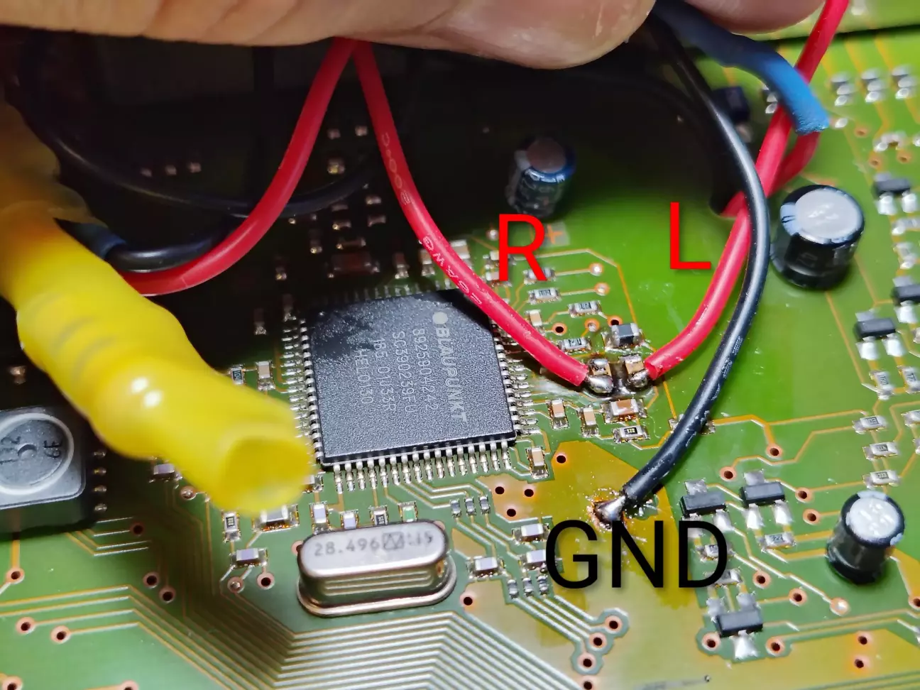Було знайдено точки входу сигналу від FM/AM, а оскільки власник не використовує радіо то вихід з блютуз модуля паяємо сюди як на фото: