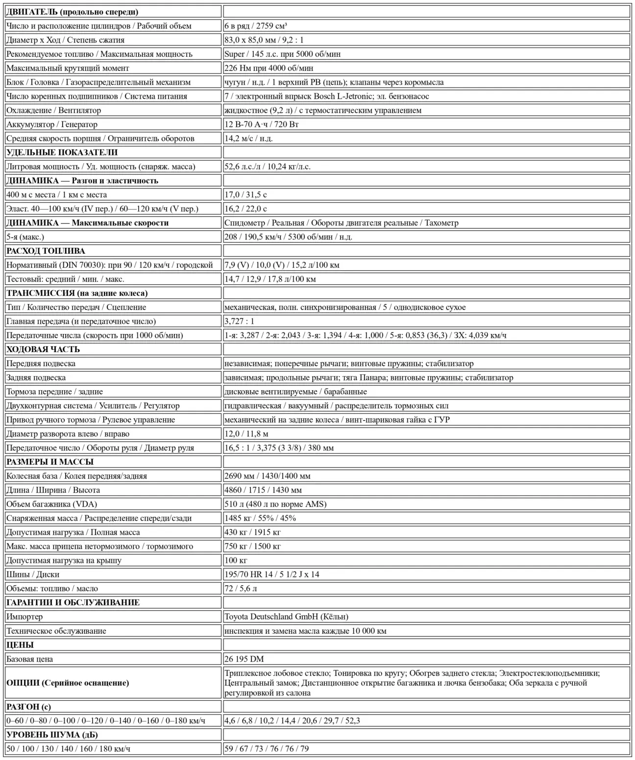 Между тем действительно значимые улучшения новой модели Toyota скрыты под внешней оболочкой. Взгляд под капот показывает, что инженеры при обновлении флагмана не остановились и перед основательной переработкой техники. Прежде всего в глаза бросается система впрыска топлива — все еще техническая редкость для японского автопрома. Фактически двигатель Crown, наряду с шестицилиндровым агрегатом Datsun 280 ZX, является единственным на данный момент инжекторным мотором восточного происхождения, предлагаемым в наших краях. Он создан на базе прежнего 2,6-литрового двигателя, от которого отличается главным образом увеличенным с 80 до 83 миллиметров диаметром цилиндра, что при неизменном ходе поршня в 85 миллиметров дает рабочий объем 2759 куб. см. Вкупе с электронной системой впрыска, выпускаемой по лицензии штутгартской фирмы Robert Bosch GmbH, эти модификации позволили поднять мощность по сравнению с предшественницей со 116 л.с. до 145 л.с. при 5000 об/мин, а максимальный крутящий момент составил 226 Нм при 4000 об/мин.