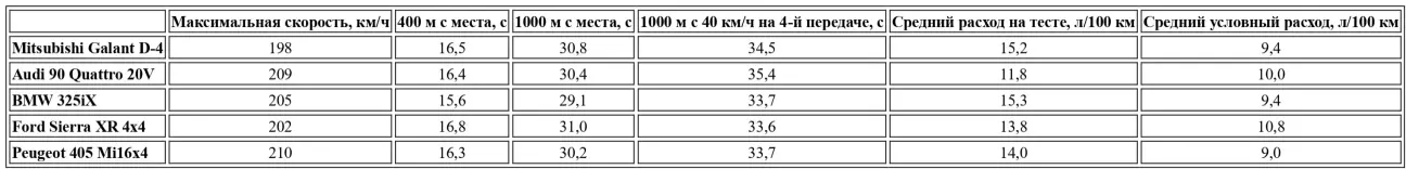 Трансмиссия. Полный привод, межосевая вискомуфта. Скорость на 1000 об/мин на 5-й передаче 31,28 км/ч. Максимальная скорость по спидометру 212 км/ч, реальная 199 км/ч при 6360 об/мин (среднее значение в двух направлениях); по спидометру 210 км/ч, реальная 197 км/ч при 6290 об/мин (в одном направлении). Расход топлива при 90 км/ч 6,9 л/100 км, при 120 км/ч 8,9 л/100 км, в городском цикле 12,3 л/100 км, средний 15,2 л/100 км, минимальный 11,5 л/100 км, максимальный 19,6 л/100 км.
