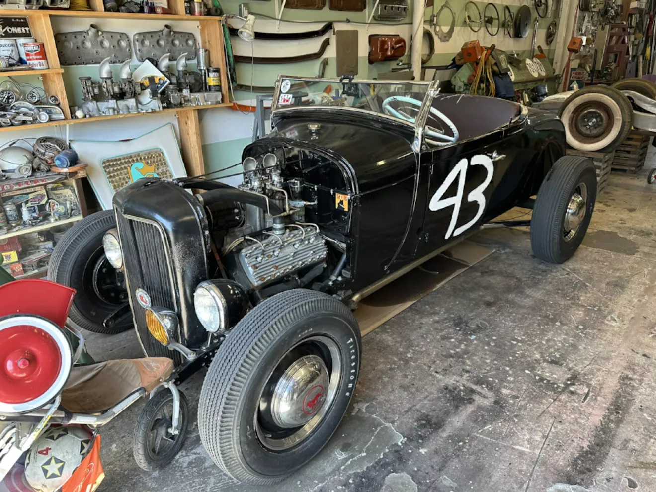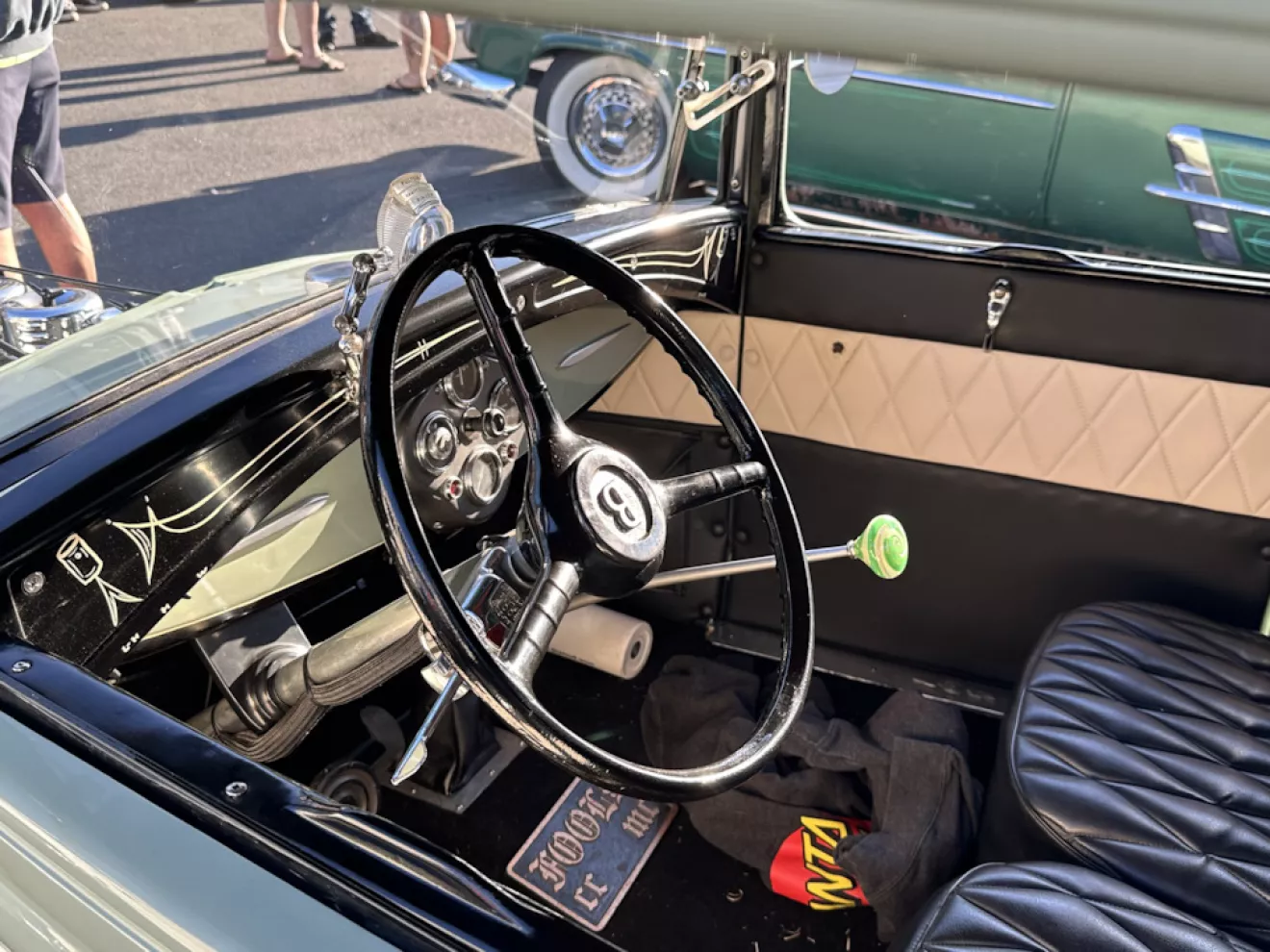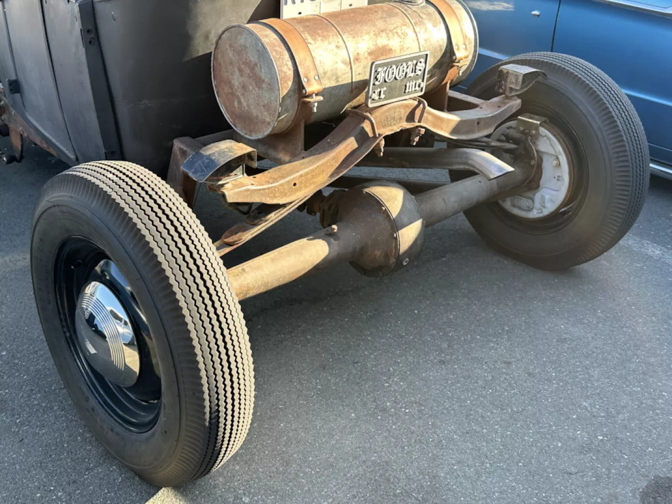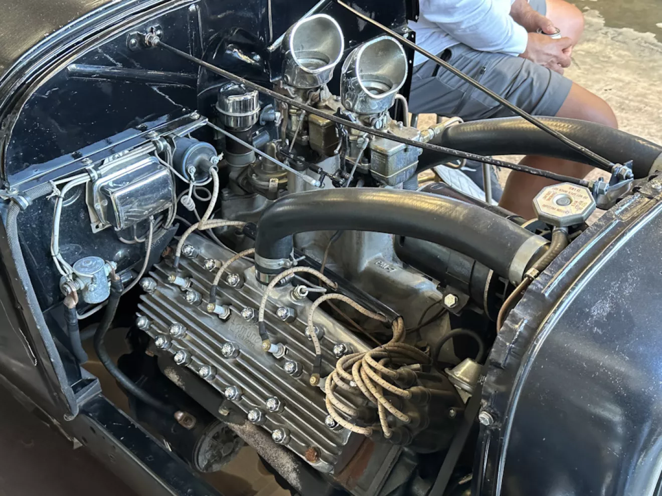 На родстере стоит родная рама Форд А, относительно ранний двигатель Флатхед (нижнеклапанный V8 Фордов с 1932 по 1955й годы), 3-скоростная коробка, цельный задний мост с быстросменной ГП чтобы при желании перенастроить машины с трассовой на гоночную и обратно, и т.д. Все это сделало именно эту машину самой большой находкой для меня в этой поездке, а видел я тогда их сотни и сотни. Настоящий, чистейший хотрод из истоков, никакого вранья, пыли в глаза и халтуры.