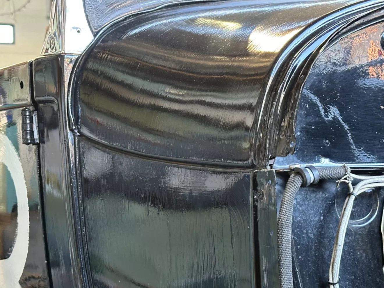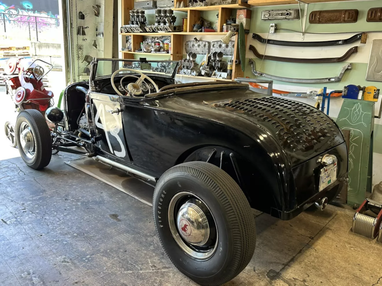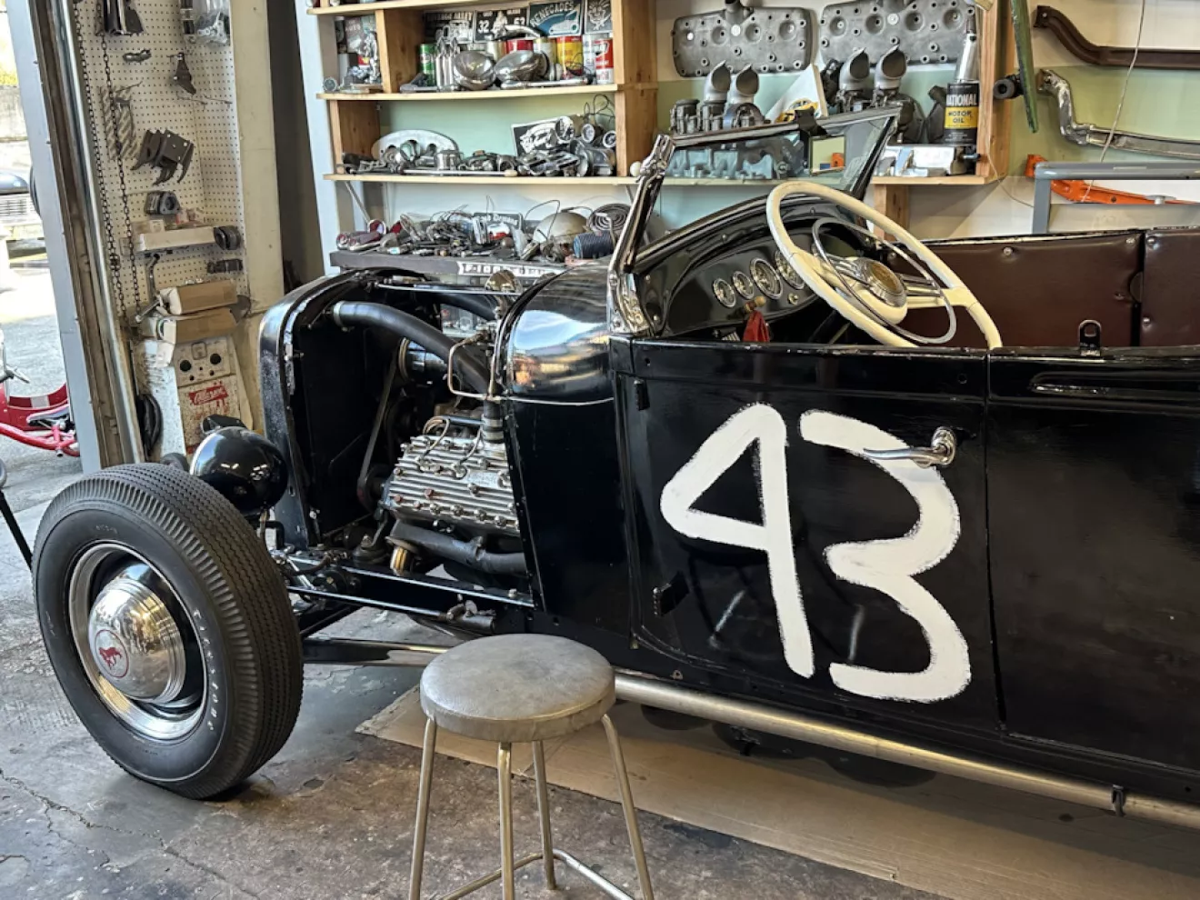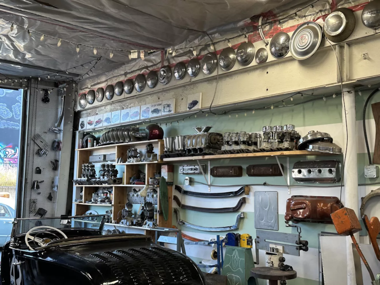 В традиционном стиле ценятся доработки с использованием запчастей из выбранного периода — тюнячки из 40-50ых гг, высокие диагональные шины и т.д. Несмотря на казалось бы аскетичность этого стиля, строители хотродов и тут умудряются все опошлить чрезмерным стремлением утереть всем нос и сделать круче всех. Машины Ли Гранта при этом сделаны трезво, честно и сохраняют редкий баланс — там просто все каким-то образом правильно. И как иллюстрация этого, посреди мастерской стоял родстер самого Ли — черный Форд А, собранный из оригинальных запчастей, а также тюнячек выпуском не старше 1949 года — а доработок при этом там впечатляющее количество.