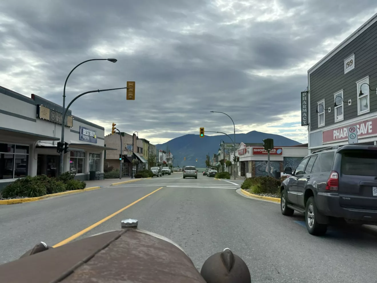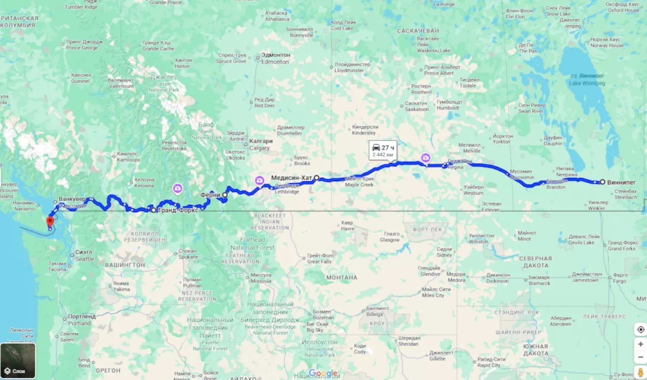 Поражающие воображение виды гор будут продолжаться очень долго и в какой-то момент голова перегрузилась впечатлениями и все стало восприниматься буднично. В этот день мы делали остановки в попутных городках, искали семейные take away ресторанчики, и поэтому остановились уже вскоре в городке Гранд Форкс, на самой границе с США.