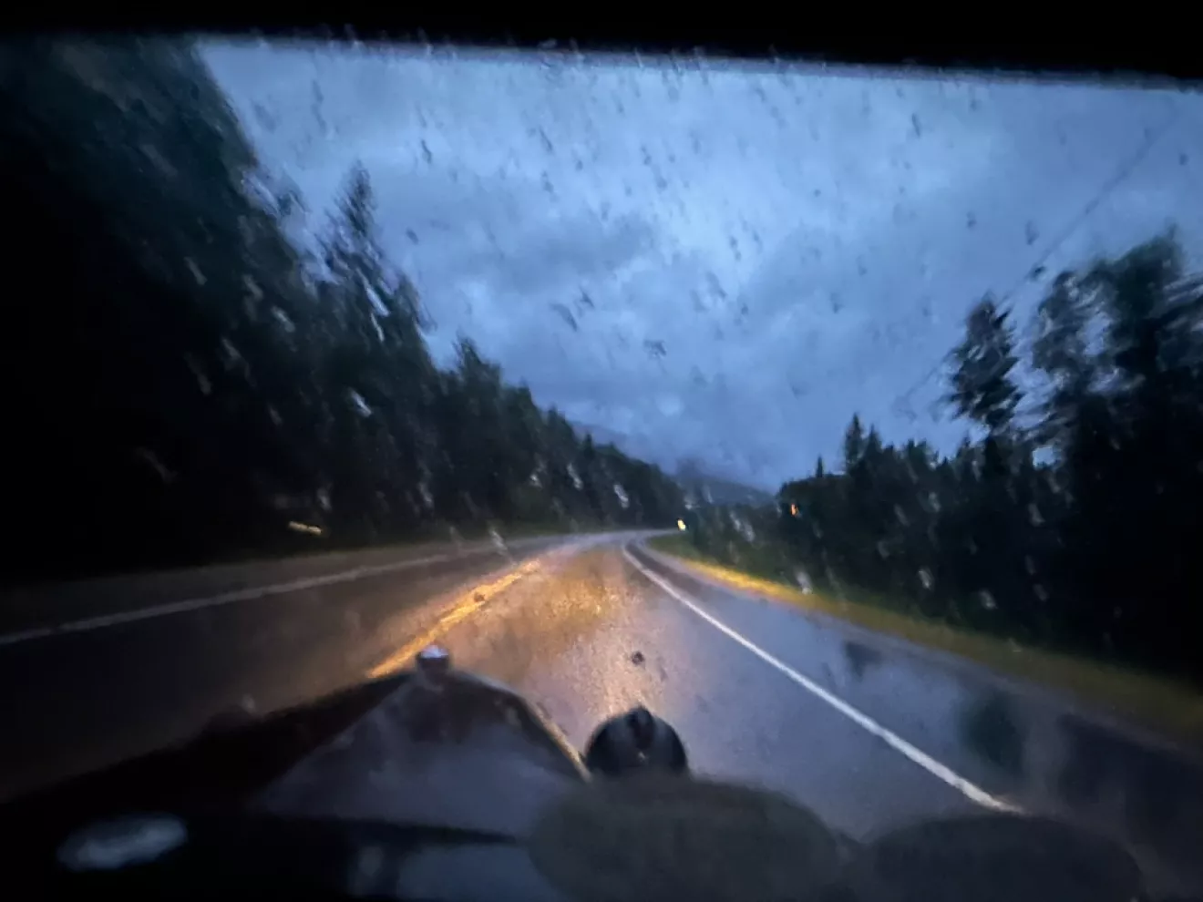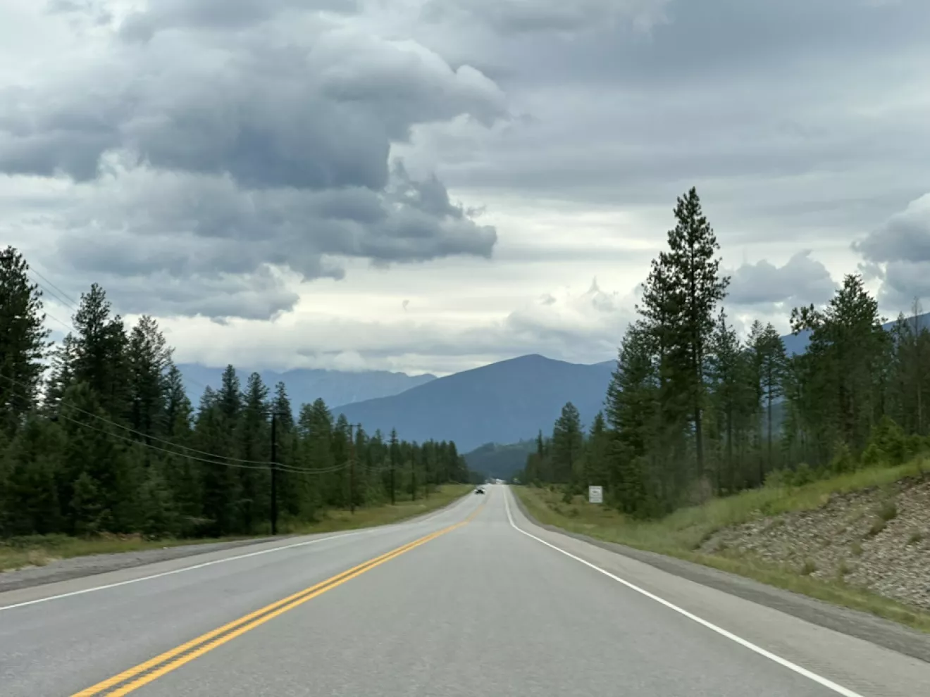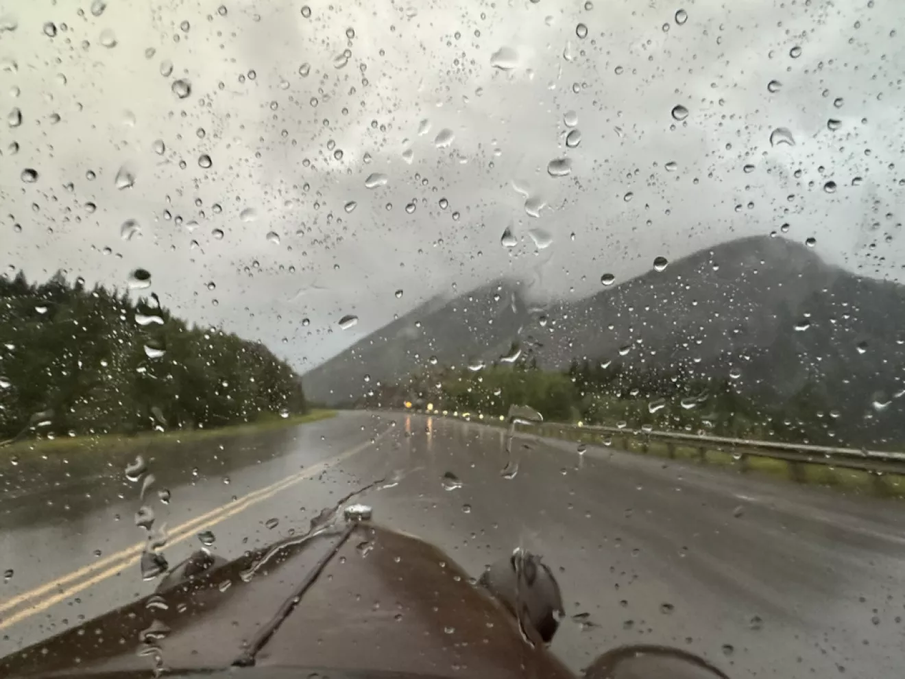 В целом в машине было сухо, сами не промокли, но вода просачивалась сверху лобовухи в щель под крышей и текла вниз мешая обзору. Приходилось постоянно протирать стекло. По ходу поездки навещали знакомых в Летбридже (Альберта) — там же и начались Скалистые горы. День завершился только уже в темноте, под ливнем, в городке Ферни на востоке Британской Колумбии.
