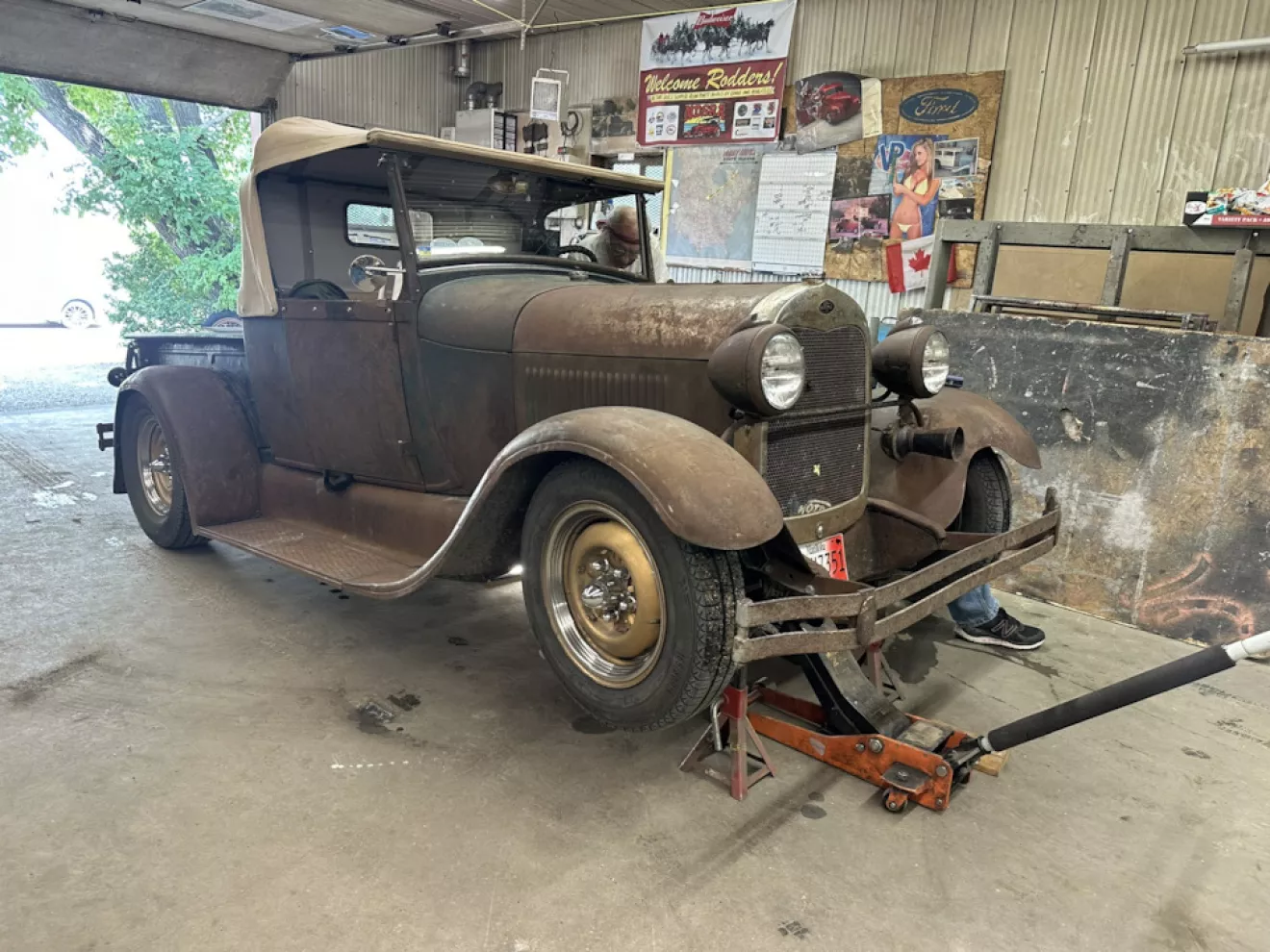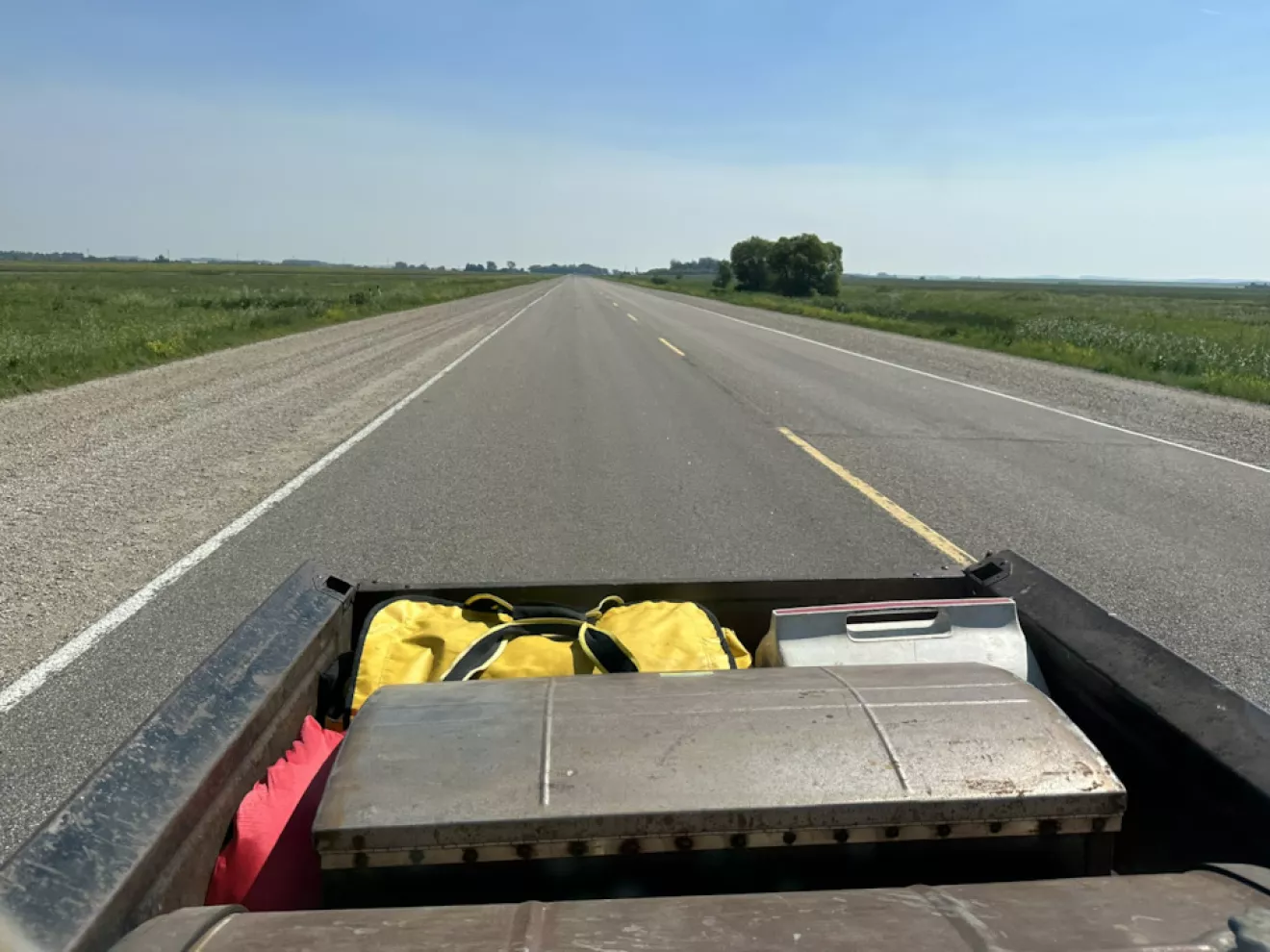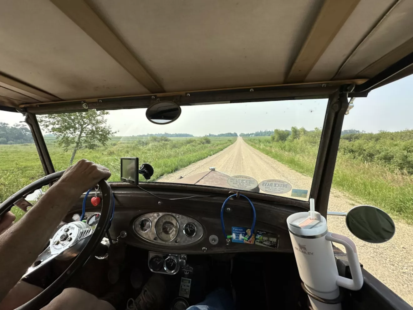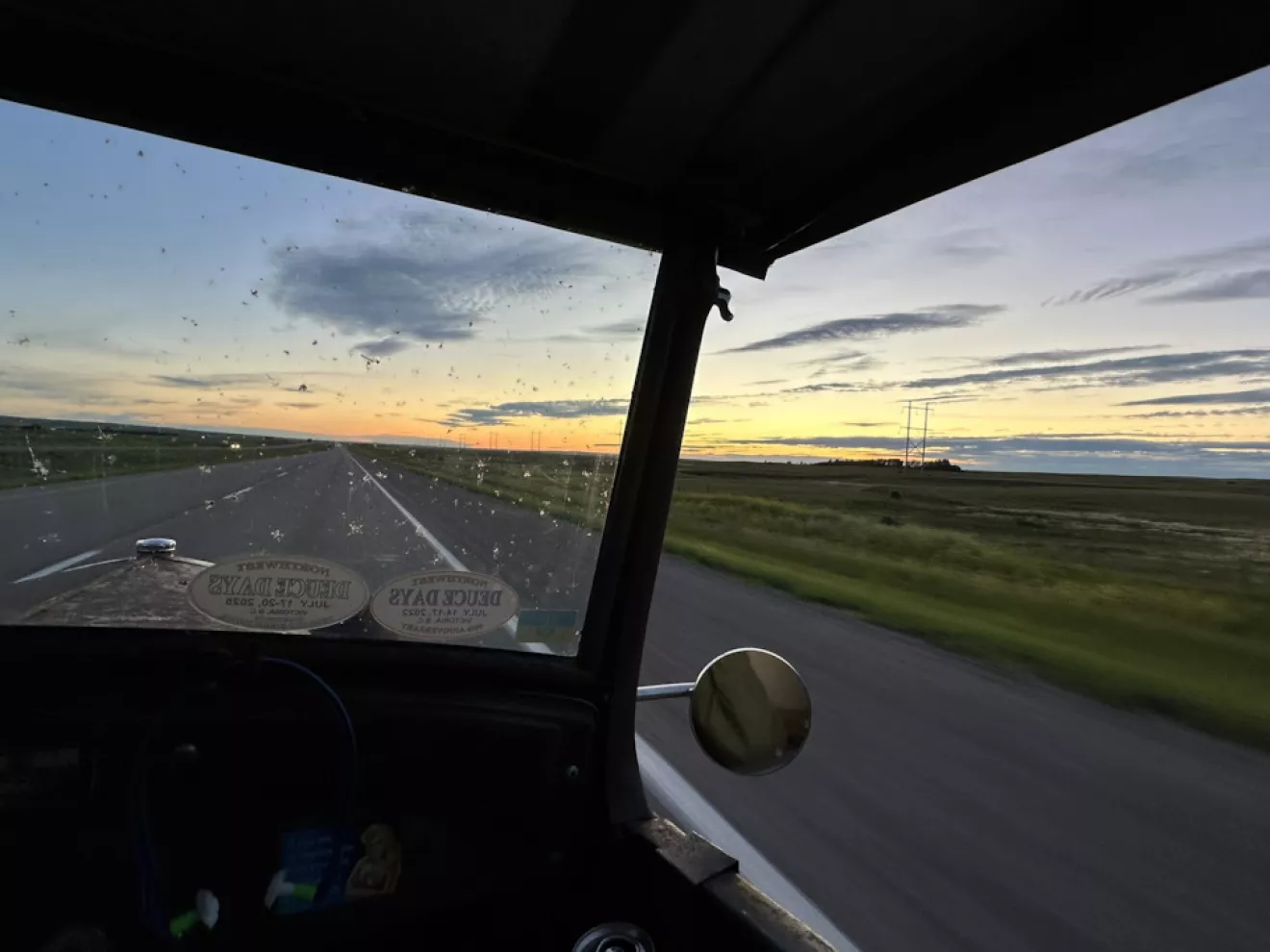 Однако почти сразу же пришлось заехать в пит стоп. Пробег на родстере в 2025 году был близок к нулю — и за зиму видимо прихватило напольную педаль тормоза. Заехали в город Брэндон (второй после Виннипега крупный город Манитобы) — там по удачному стечению обстоятельств живет знакомый строитель хотродов, его мастерская называется Alley Cats Hot Rods. Педаль слегка отпустили на узле, смазали — и все заработало.