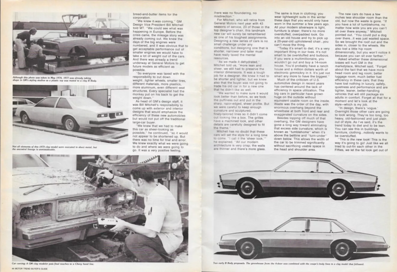 Новый автомобиль, идущий в продажу как Chevrolet Caprice или Impala («Каприс» — более дорогой), стал результатом комплексной работы и был полноценно новым. Работа над ним началась уже в 1970 году, причем с самого начала он создавался как «усушенный». К счастью для General Motors, руководство во главе с главным конструктором Биллом Митчеллом очень чутко осознавало грядущую реальность — и специалистам практически всех отделов разработки автомобилей, вводилось задание делать всё компактнее и легче – будь то каркас сиденья, рычаг подвески или целая рама. В конструкцию вводилось больше пластика, алюминия, новых материалов. Новые тренды уже из докризисных времен вовсю «дули» из Европы, поэтому к своему каноничному «чемоданному» облику, новый Chevrolet пришел далеко не сразу.