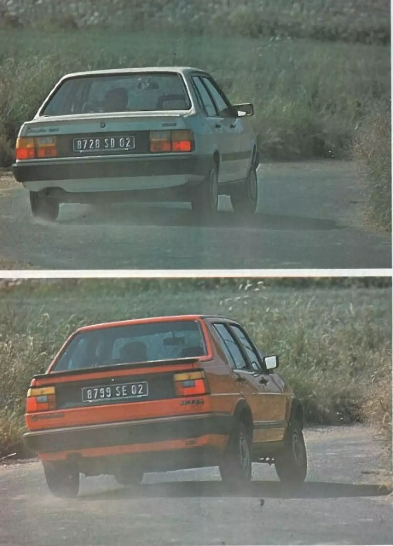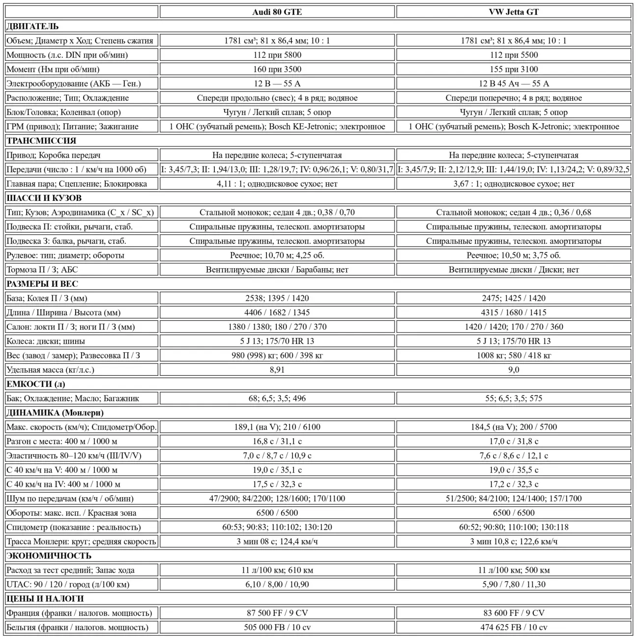 Невзрачные снаружи, но очень эффективные и убедительные в деле, эти две машины действительно жаль, что не имеют большего успеха. По крайней мере во Франции они проходят мимо карьеры, которая могла бы — и даже должна была бы — быть куда более блестящей. Похоже, владельцы Audi 80 GTE или VW Jetta GT — люди знающие. Сдержанные ценители, не склонные к пусканию пыли в глаза. Это логично. Нам показалось интересным привлечь внимание к этим двум недооцененным моделям; некоторые наверняка будут удивлены их возможностями, но факт остается фактом: Audi стоило бы поскорее подготовить для будущей Audi 80 кузов в стиле Audi 100. Что касается Jetta, то хотя ее обычно считают более удачной, чем предыдущую версию, она остается решительно слишком банальной. И жаль также, что ее показатели не дотягивают до уровня кузины из Ингольштадта.