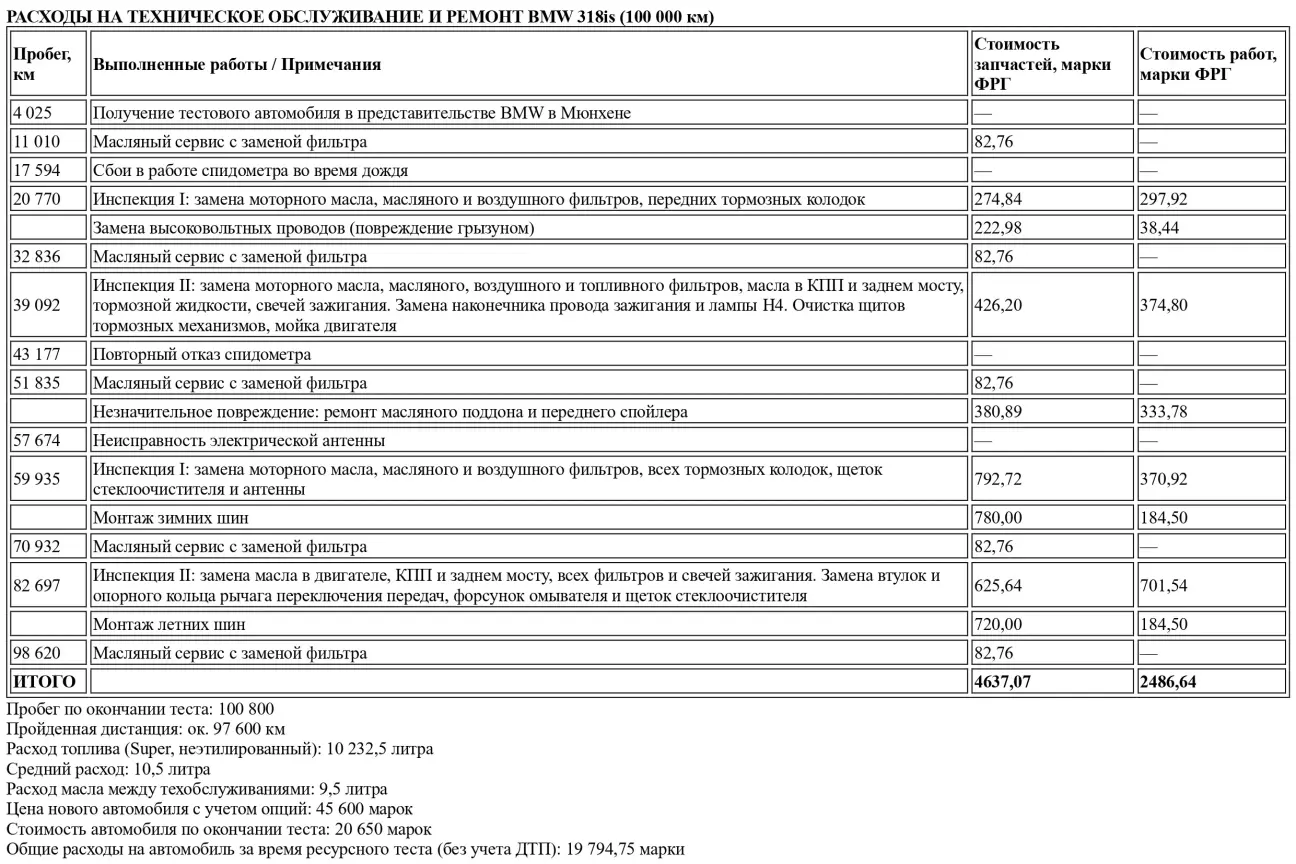 Благодаря своей неизменно хорошей форме 318is завоевала симпатии всей редакции. Она стала излюбленным средством передвижения в командировках. Непоколебимая надежность и низкий расход топлива почти не обременяли редакционный бюджет. В Скандинавии, например, 1,8-литровый четырехцилиндровый мотор довольствовался скромными 7 литрами неэтилированного бензина Super на 100 километров, что при 55-литровом баке позволяло проезжать без дозаправки почти 800 километров. Абсолютный максимум потребления составил 14 литров Super на пустом ночном автобане при движении в предельном темпе. Впрочем, в столь приятной экономичности топлива редакторам sport auto нередко приходилось убеждаться с помощью калькулятора. Ведь после 82 000 километров «медный червь» начал все активнее подтачивать электрику где-то между датчиком импульсов на задней оси и комбинацией приборов. В результате стрелка спидометра во время движения могла внезапно бессильно упасть на ограничитель. Вместе с ней останавливался и счетчик пробега. Указатель мгновенного расхода топлива в такие моменты выдавал фантастические значения. Чаще всего эти сбои случались в сырую погоду. Самый долгий отказ спидометра растянулся примерно на 200 километров. В общей сложности на одометре не хватает около 800 километров.
