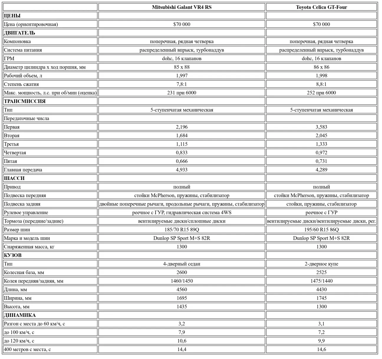 На бумаге Celica начинает сравнение с небольшим преимуществом в компоновке: она короче и ниже, но при этом стоит на более широкой колее, чем Galant VR4 с кузовом седан. У обоих — поперечно расположенные четырехцилиндровые двигатели объемом 2,0 литра, с двумя распредвалами, 16 клапанами, одним турбокомпрессором и интеркулером у каждого. Грег Карр отметил, что интеркулер Toyota, расположенный поверх клапанных крышек, гораздо менее подвержен повреждениям, чем агрегат Galant, висящий за передним воздухозаборником. В стандартной комплектации Toyota заявляет 208 л.с. при 6000 об/мин и 281 Нм при 3200 об/мин для своей GT-Four с электростеклоподъемниками, кондиционером и прочими атрибутами комфорта. (Автомобили Группы А, к слову, выдают около 300 л.с.). Заметно более плавный двигатель Mitsubishi, несмотря на наличие балансирных валов, в заводском исполнении чуть менее мощный: 201 л.с. при 6000 об/мин и 279 Нм при 3000 об/мин.