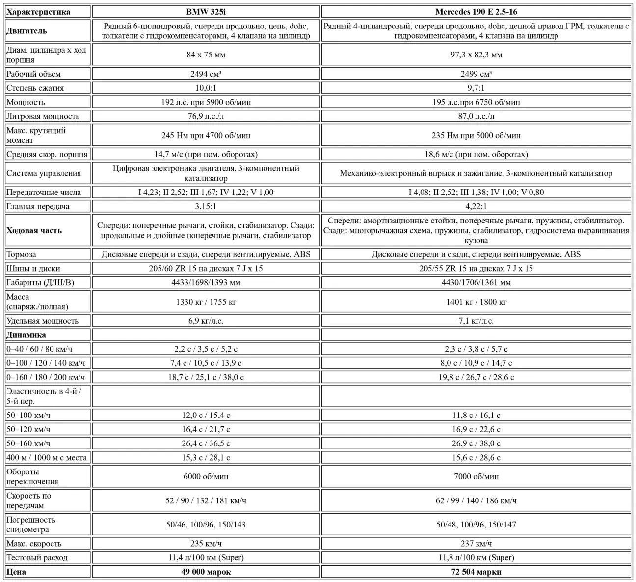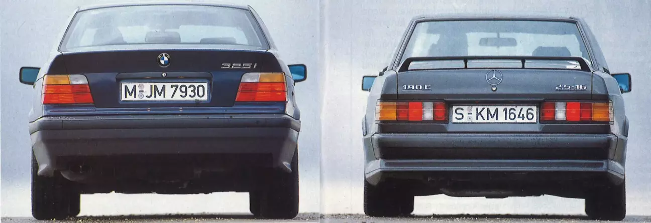 Резюме в этом увлекательном сравнении напрашивается само собой. Тот, кто ищет идеальный, компактный и комфортабельный спортивный седан, найдет его в лице новой BMW 325i. Тому же, кто хочет получить настоящий, бескомпромиссный спорткар в обличии седана, принесет радость по-прежнему актуальный 2.5-16 — при условии, что тугой банковский счет избавляет его от материальных забот. Ведь Mercedes стоит на внушительные 23 500 марок дороже BMW, что может заставить даже преданных фанатов трехлучевой звезды сделать выбор в пользу Мюнхена. Ответ на новую 3-ю серию Mercedes даст в 1992 году с выходом нового 190-го. А пока в по-настоящему серьезном обновлении нуждается лишь одно — прайс-лист.