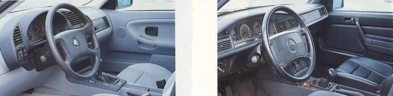 Водительские места BMW уже много лет считаются эталонными, и новая «трешка» не стала исключением. Приборы, кнопки и рычаги расположены попросту идеально, при этом всё выглядит элегантно и добротно. Лишь совершенно излишний указатель мгновенного расхода топлива да перегруженный функциями, игрушечный бортовой компьютер несколько портят впечатление деловитой целесообразности. Впрочем, эконометр BMW хотя бы размечен в литрах, в то время как аналогичный прибор в Mercedes позволяет сделать лишь глубокомысленный вывод: кто много жмет на газ, тот тратит много топлива. В обоих случаях на столь видном месте в комбинации приборов было бы логичнее разместить указатель температуры масла. В Mercedes он есть, но спрятан глубоко внизу центральной консоли.