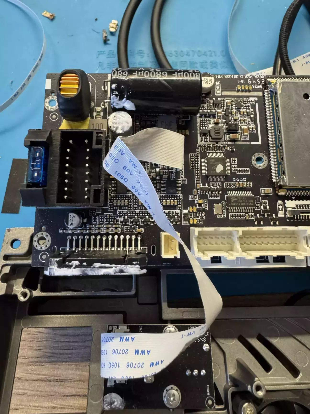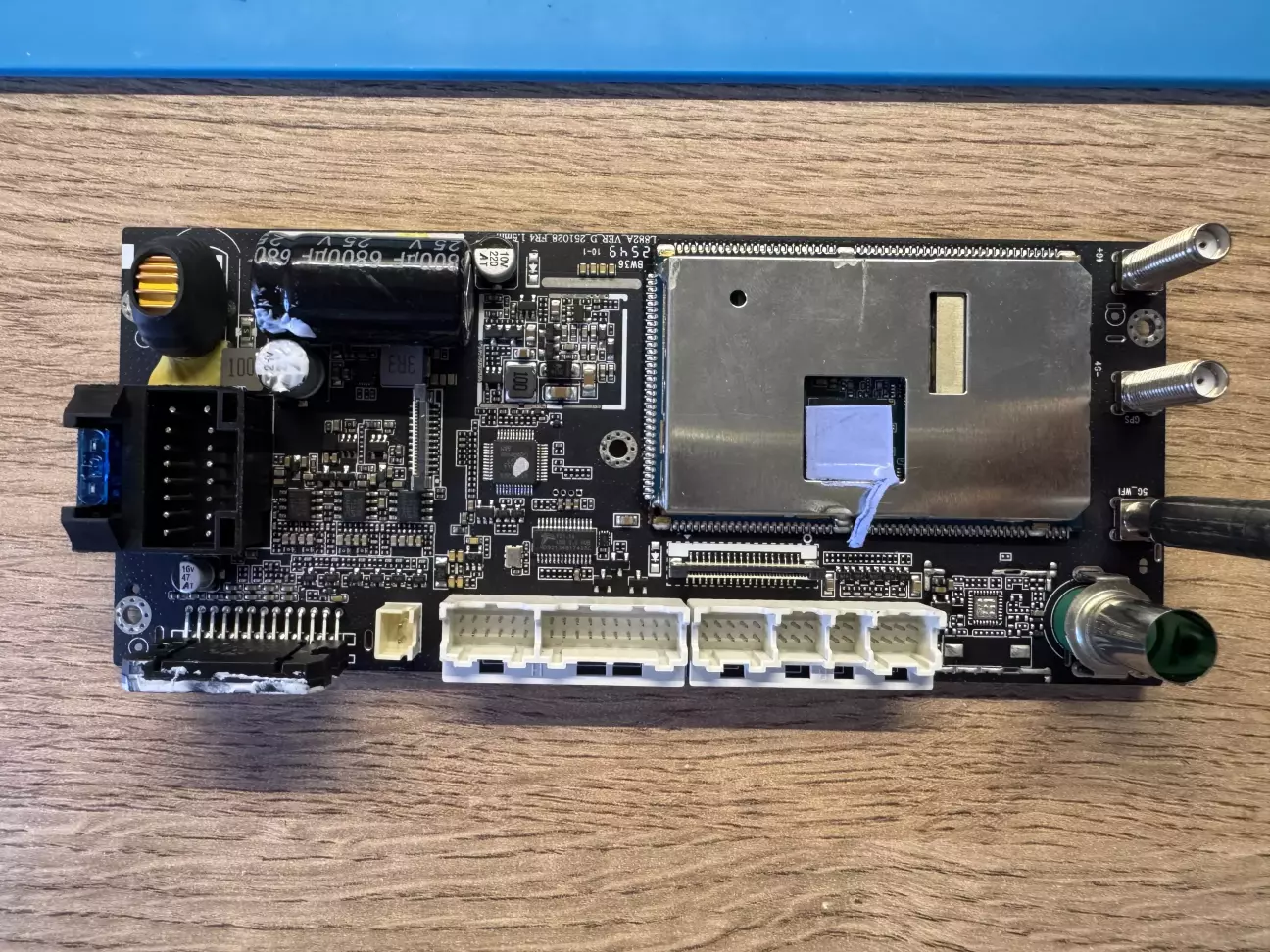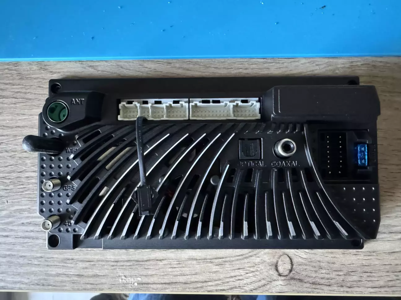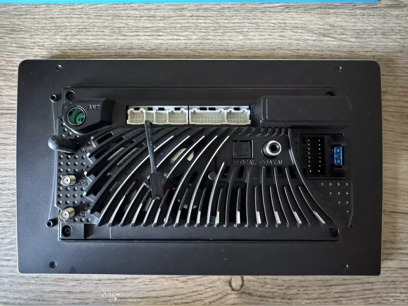 Кабелі там стандартні, тому вони нас не цікавлять. Давайте глянемо на плату з радіатором. Дорого-багато. Якісно. Бачимо оптичний вихід, конектори для антен і стандартні роз'єми. Вентилятора не видно, але він є, кабель і конектор його виведено назовні (навіщо не зрозуміло, але в цілому так було на FYT UIS7862(S) в половині ревізій.