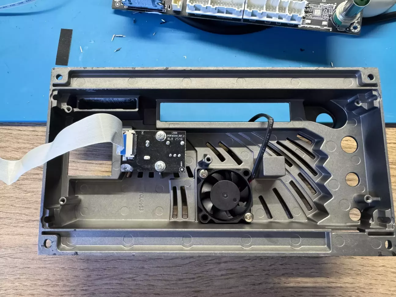 Вентилятор захований всередині. Плата оптики стала тут на шлейфіку. Навіщо? Я не знаю, взагалі треба 3 контакти, а не це все, але то таке, зробили і зробили. Гірше точно не стало.