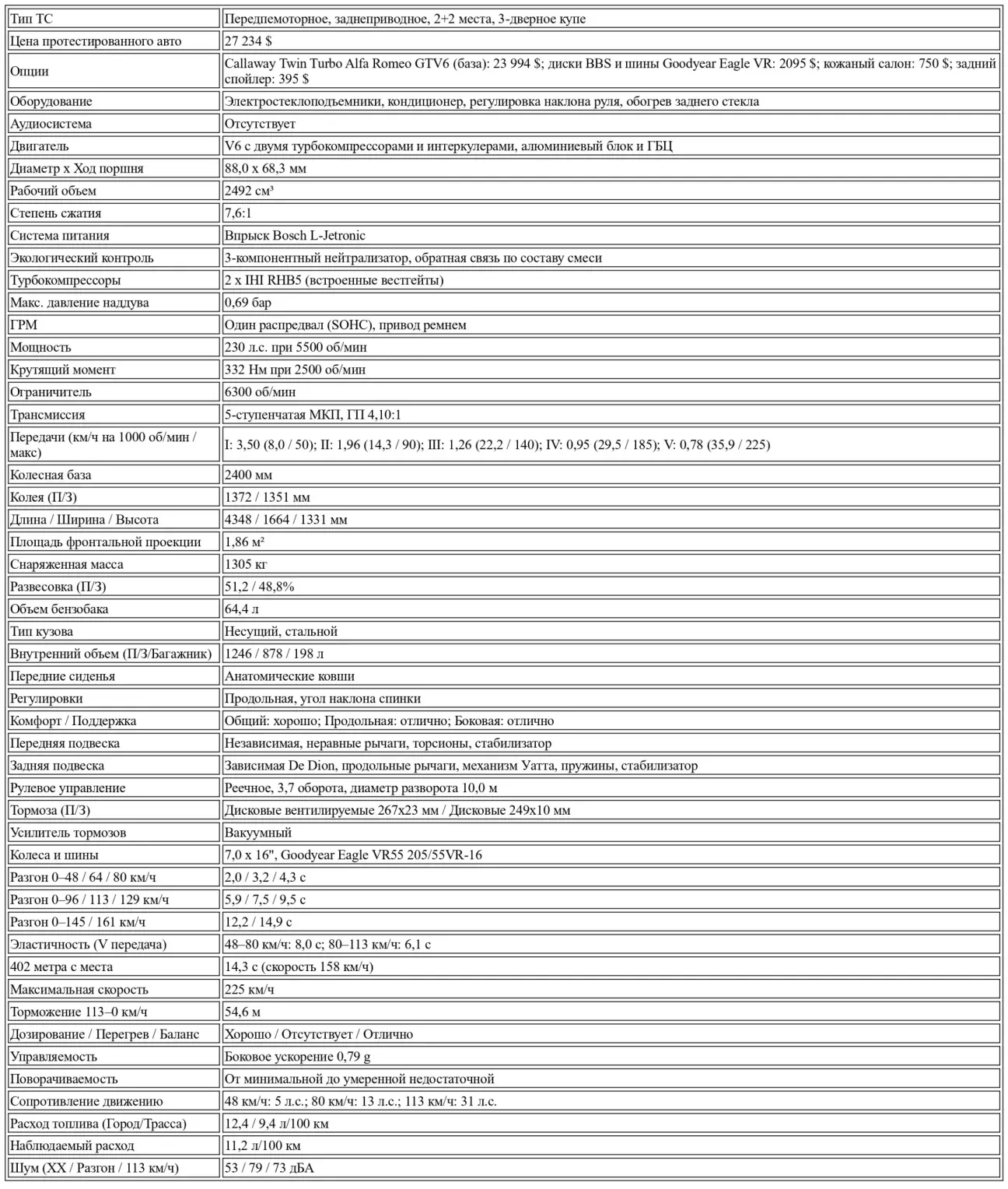 Нашу правоту наглядно доказывает особая Alfa Romeo GTV6, доработанная в ателье Callaway Turbosystems из Олд-Лайма, штат Коннектикут. Стандартный 2,5-литровый двигатель Alfa Romeo мощностью 154 л.с. был переведен в гипертрофированное состояние путем установки двух турбокомпрессоров и промежуточных охладителей. Полученные в итоге 230 л.с. способны катапультировать Alfa Romeo Twin Turbo с места до 96 км/ч всего за 5,9 секунды и прострелить дистанцию в 402 метра за 14,3 секунды со скоростью на выходе 158 км/ч. (Для сравнения: стандартная Alfa Romeo GTV6, которую мы тестировали в мае прошлого года, достигала отметки 96 км/ч за 8,2 секунды, а четверть мили проходила за 16,1 секунды при скорости 132 км/ч). Максимальная скорость ограничена на отметке 225 км/ч красной зоной тахометра на 6300 об/мин (прирост составил 16 км/ч), хотя мотор охотно готов крутиться и дальше. Такого потенциала достаточно, чтобы Alfa Romeo Twin Turbo держалась на равных с самыми быстрыми автомобилями в стране.