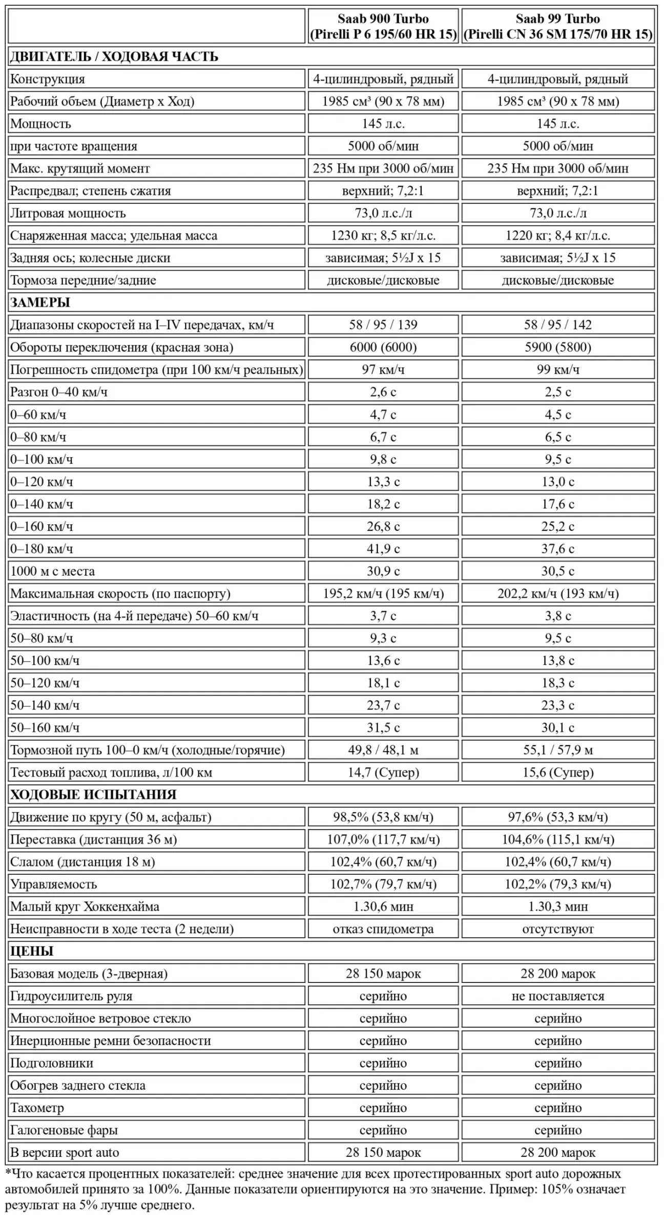 В ходе тестовой поездки sport auto цели Saab подтвердились: в дисциплине разгона этот турбо-спортсмен выстреливал до сотни еще быстрее, чем его более тяжелые братья из сравнительного теста. С результатом 8,9 секунды он оказался на 0,6 секунды быстрее комби-купе 99, а на скорости 160 км/ч разница составила уже 1,7 секунды. На максимальной скорости трехобъемный кузов сказался слегка сдерживающе. 99-й, несмотря на более низкий передний спойлер, не дотянул до показателей 900 Turbo. Впрочем, достигнутые 194 км/ч после более длительной обкатки могут быть слегка перекрыты.